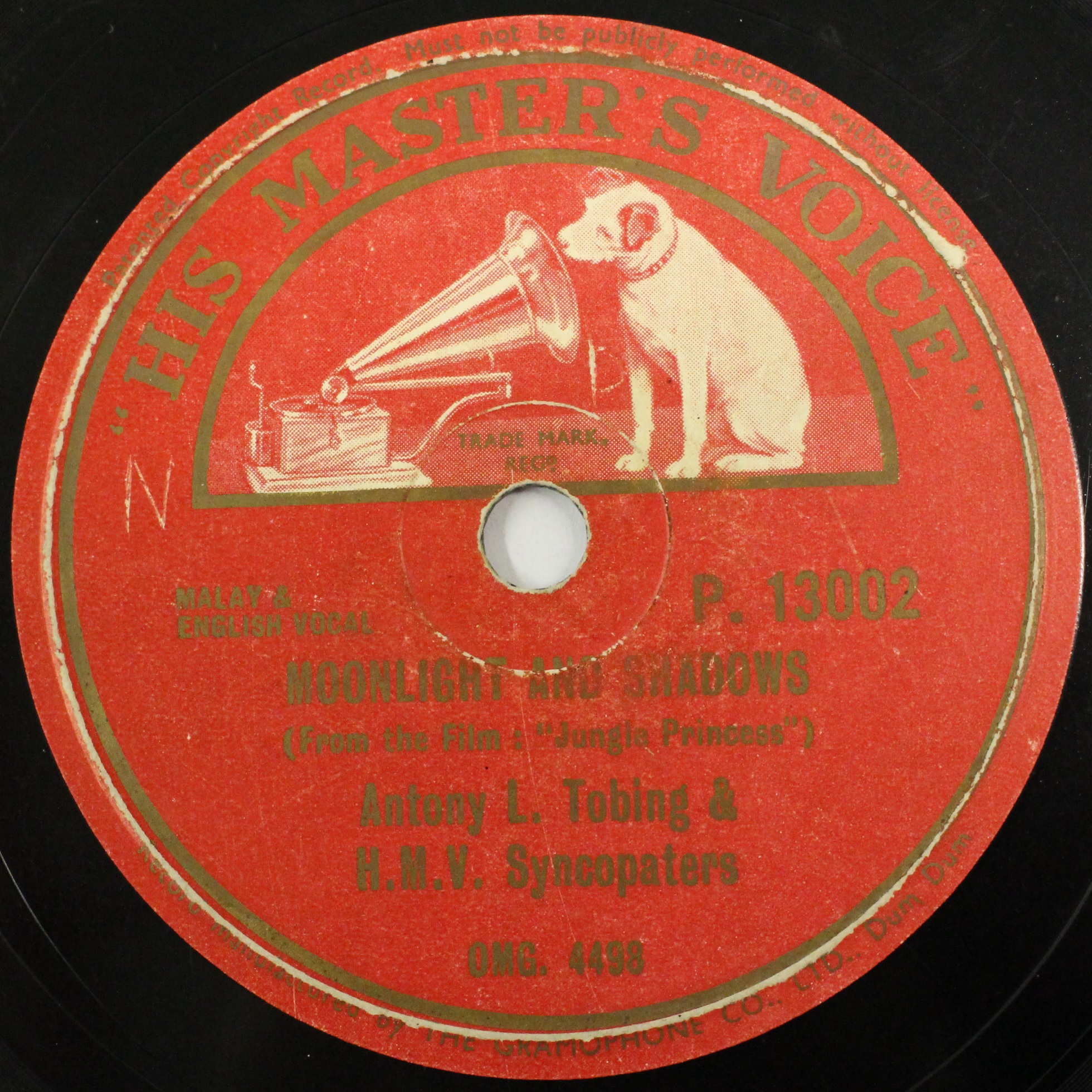 Side B contains a cover of 'Moonlight and Shadows', a song made famous by American actress Dorothy Lamour in the 1936 film 'The Jungle Princess'. Although shot in Hollywood, the film was set in the jungles of Pahang where the protagonist Ulah, a Malayan girl played by Lamour, grew up with a fearsome tiger and giant chimpanzee. 'The Jungle Princess' was notable for its use of the Malay language (in which Lamour speaks and sings 'Moonlight and Shadows' during the course of the film), and a large variety of animals – one scene features a horde of elephants stampeding through a Malay kampong.