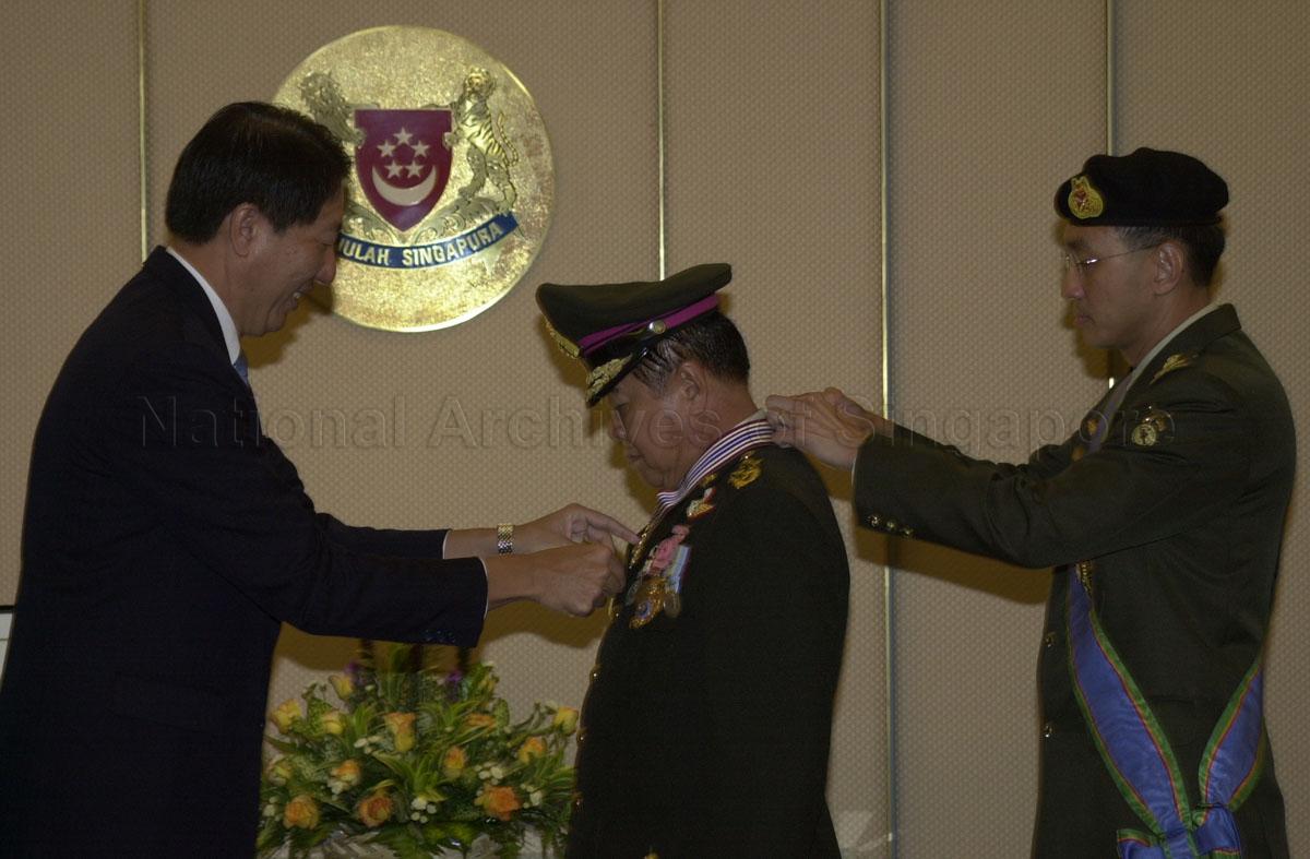 1. The Commander-in-Chief of the Royal Thai Army, General Prawit Wongsuwon, was conferred Singapore’s prestigious military award, Pingat Jasa Gemilang (Tentera), or the Meritorious Service Medal (Military), by Minister for Defence Teo Chee Hean at an investiture ceremony held in the Ministry of Defence this morning.