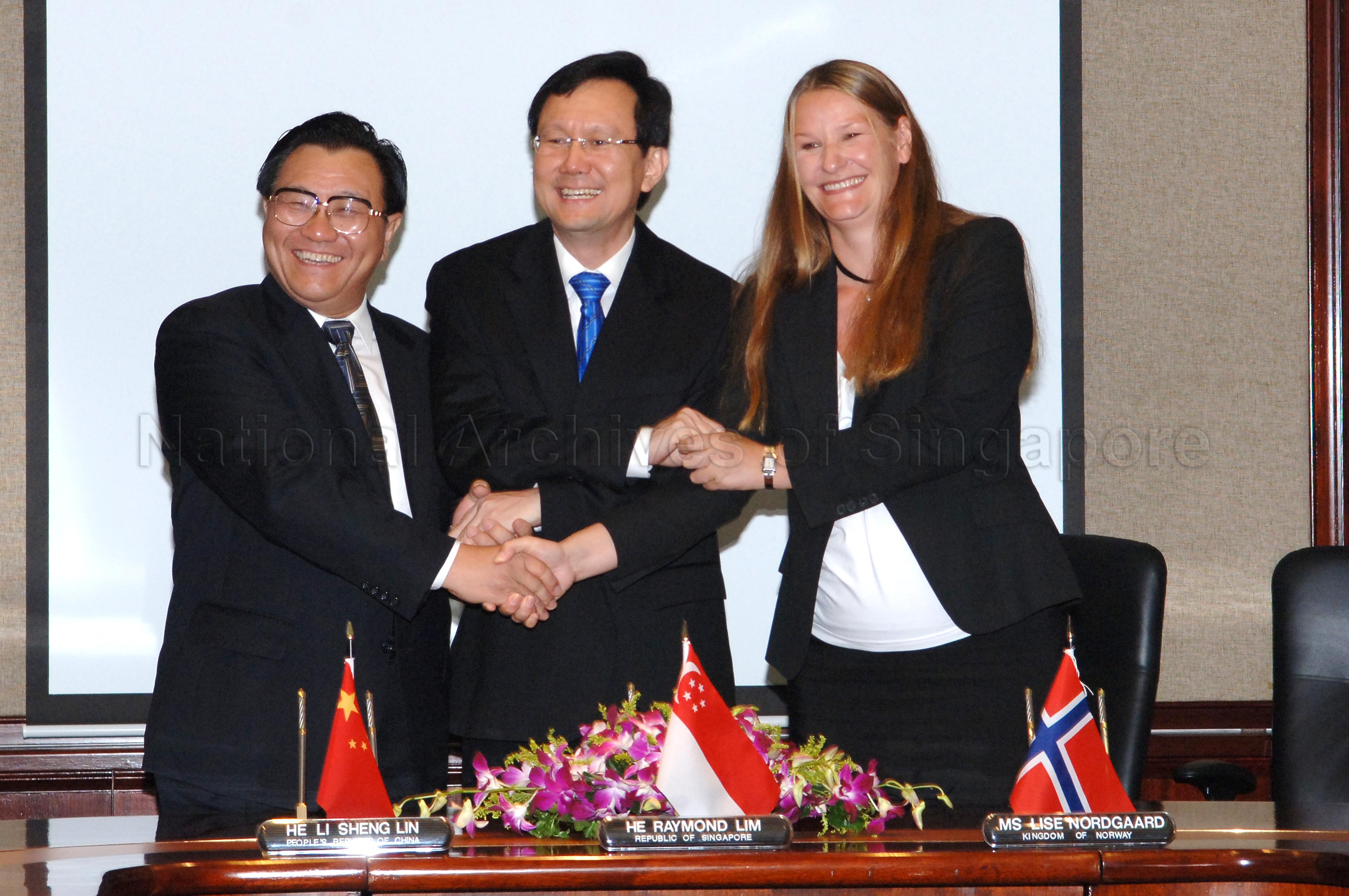 The Ministry of Transport of the Republic of Singapore, Ministry of Communications of the People’s Republic of China, and the Ministry of Trade and Industry of the Kingdom of Norway signed a MOU on Maritime Research and Development, and Education and Training today. The MOU was signed between Minister for Transport and Second Minister for Foreign Affairs, Mr Raymond Lim, Chinese Minister for Communications, Mr. Li Shenglin and Ms Lise Nordegaard, Charge d’Affaires of the Royal Norwegian Embassy.