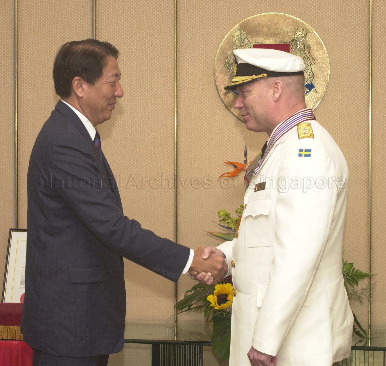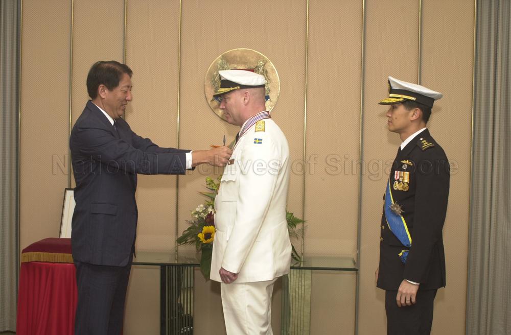 1. Rear-Admiral (RADM) Anders Grenstad, Navy Inspector of the Royal Swedish Navy, received Singapore’s prestigious military award, the Pingat Jasa Gemilang (Tentera) or Meritorious Service Medal (Military), from Minister for Defence Mr Teo Chee Hean at an investiture ceremony held at the Ministry of Defence this morning.