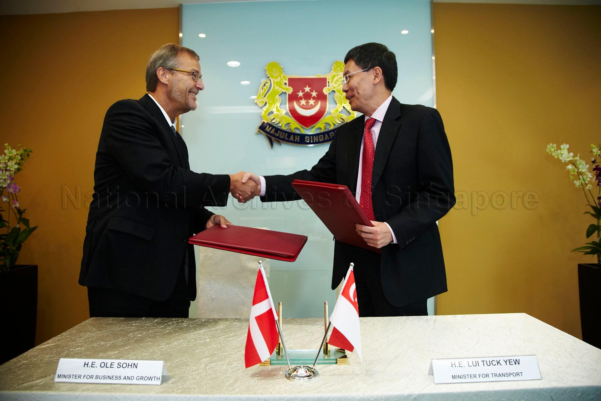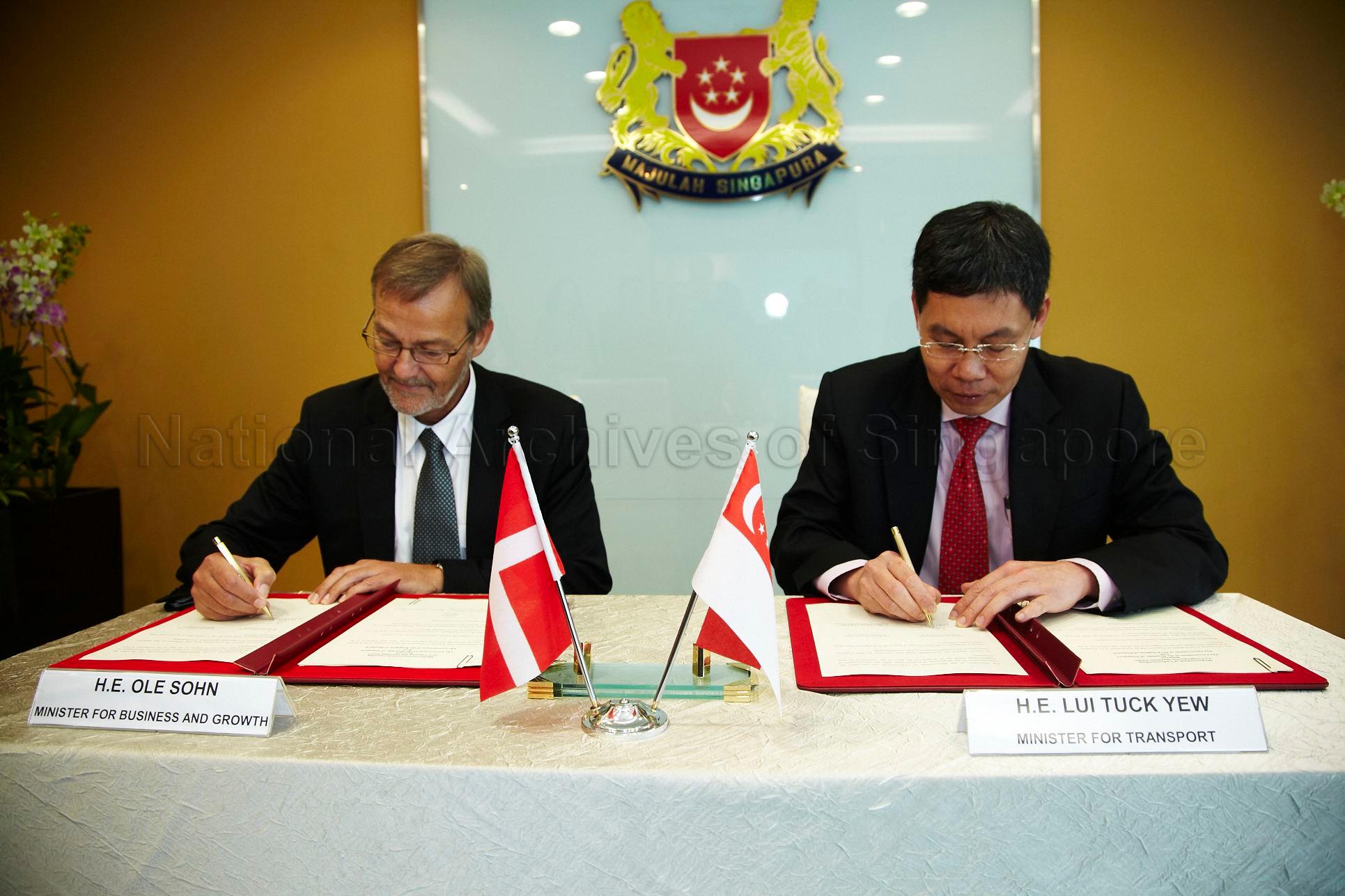 2 Mr Lui Tuck Yew, Minister for Transport, Singapore, and Mr Ole Sohn, Minister of Business and Growth, Denmark, signed the MOU today at the Ministry of Transport, Singapore.