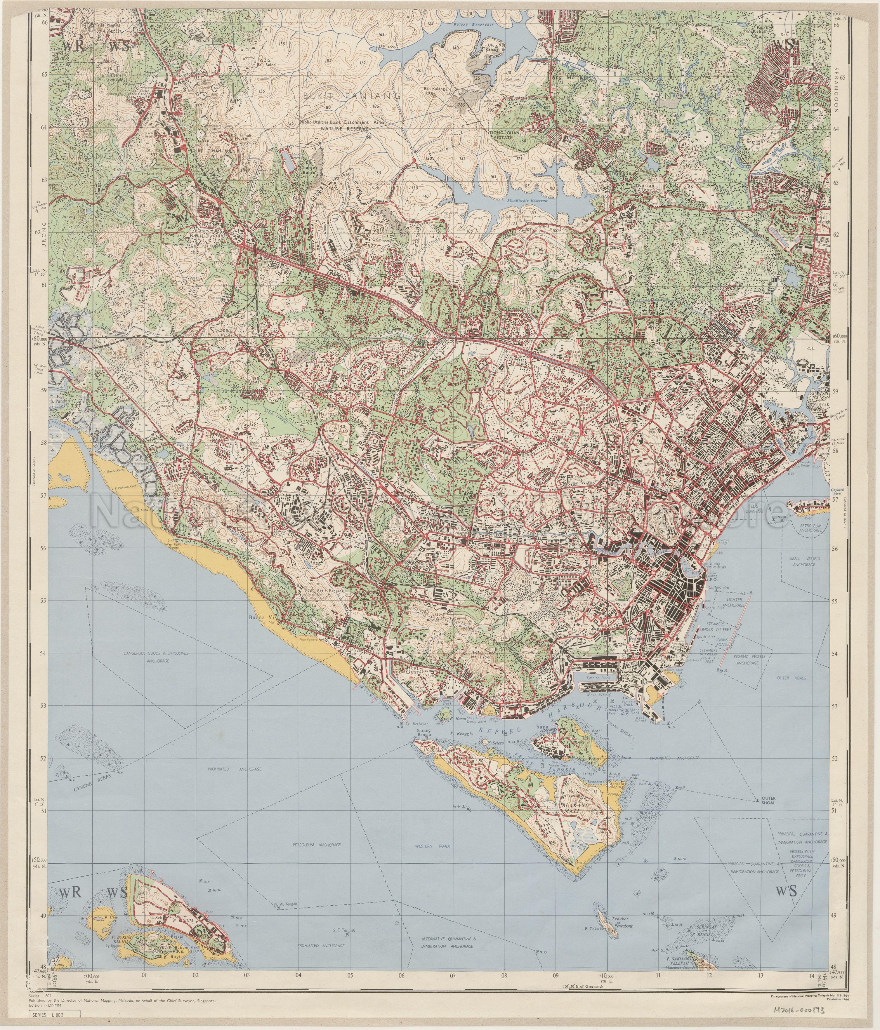 Topographical Map of central and southern Singapore, and Singapore City showing roads, tracks, railway, buildings, prominent buildings with names, swamps, vegetation, hill features, water and river features, place names, Public Utilities Board Catchment Area (Nature Reserve), Keppel Harbour, Pulau Blakang Mati (Sentosa), Pulau Brani, Pulau Bukum (Bukom), Macritchie Reservoir, Pierce Reservoir, Singapore River, Kalang River, Jurong Road, Bukit Timah Road, Upper Bukit Timah Road, Dunearn Road, Adam Road, Lornie Road, Braddell Road, Thomson Road, Upper Thomson Road, Whitley Road, Balestier Road, Serangoon Road, Upper Serangoon Road, Orchard Road, Holland Road, Farrer Road, Queensway, River Valley Road, Alexandra Road, Telok Blangah Road, Pasir Panjang Road, West Coast Road, Clementi Road, Ayer Rajah Road, North Buona Vista Road, South Buona Vista Road and others.
