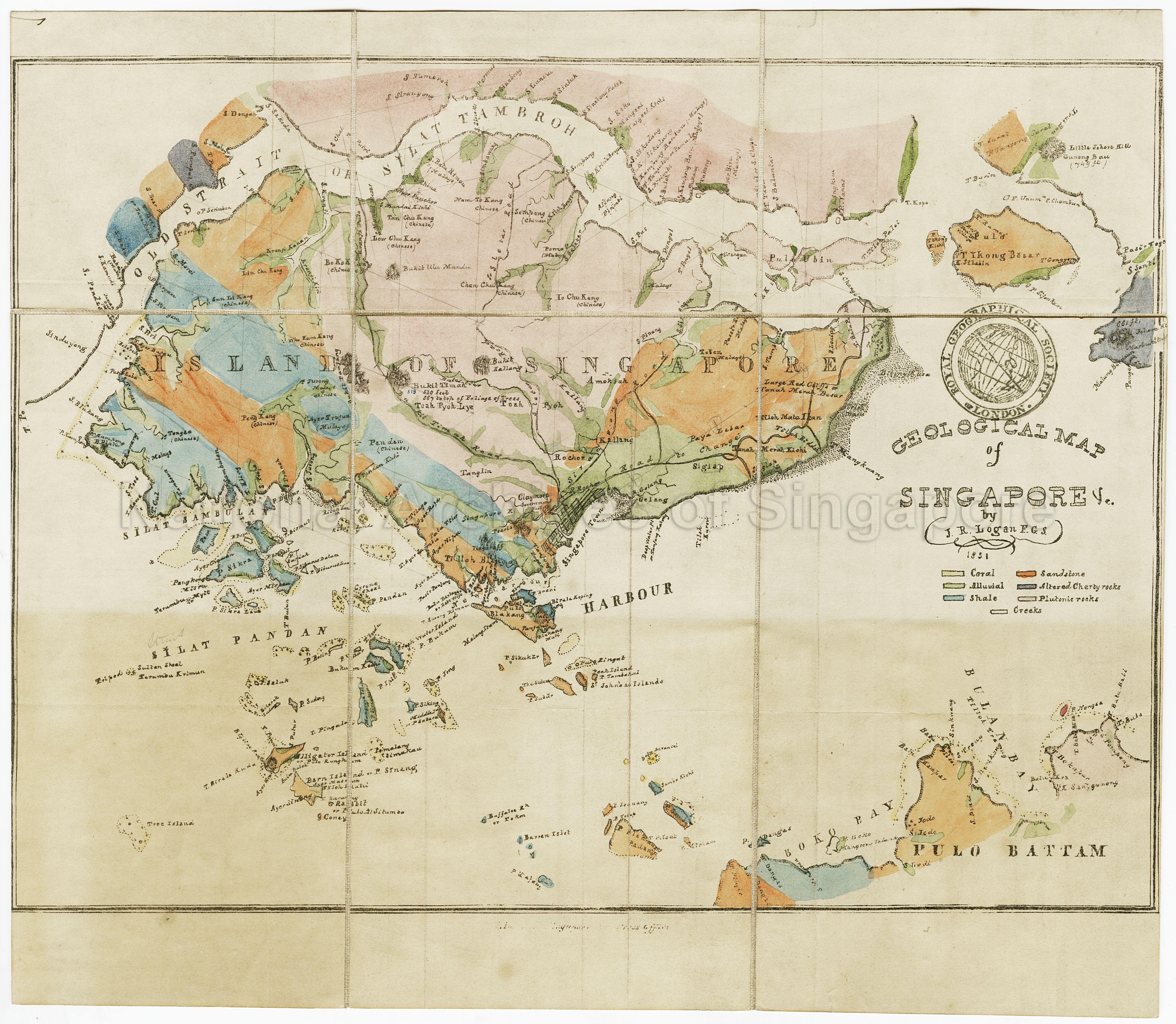 This map of Singapore, its outlying islands and the coast of Johor, shows coloured areas of different rock formations and other formations of coral, sandstone, alluvial, altered cherty rocks, shale, plutonic rocks and creeks, Singapore Town, roads, rivers, place names, Chinese and Malay settlements, hills, Bukit Timah Road (and Woodlands Road), Sletar Road (Thomson Road, Upper Thomson Road and Sembawang Road), Sirangong (Serangoon) Road, road to Changi (Geylang Road, Changi Road and Upper Changi Road), and others.