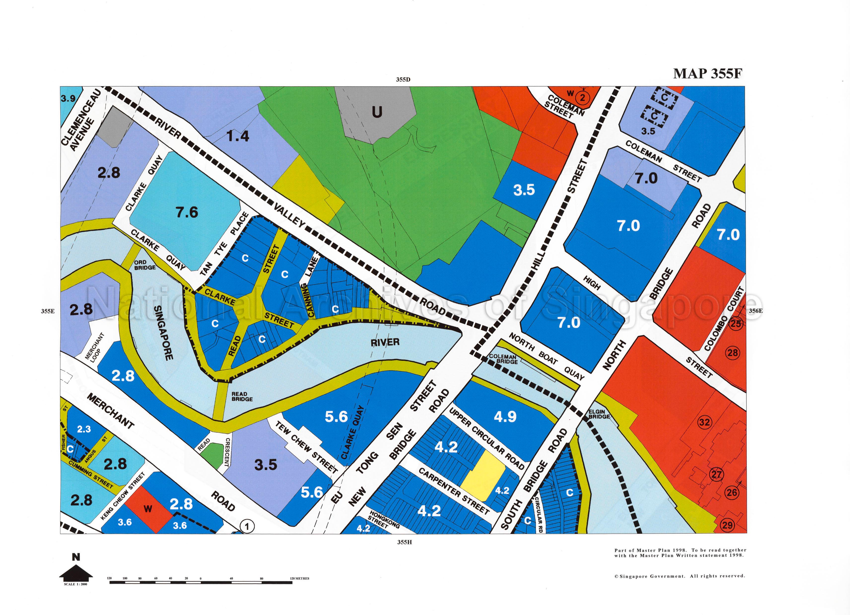 Master Plan 1998 Volume 3: Map 355F shows lot boundaries, building outlines, areas for commercial and residential, commercial, hotel, civic and community institution, reserve site, place of worship, open space, park and garden, waterbody, transport facilities, utility and conservation area, and others in Central Area, in the vicinity of Clarke Quay Mass Rapid Transit Station, Singapore River, Merchant Road, South Bridge Road, North Bridge Road, High Street, Coleman Street, Hill Street, New Bridge Road, Eu Tong Sen Street, River Valley Road, Clemenceau Avenue, Read Street and Clarke Quay.