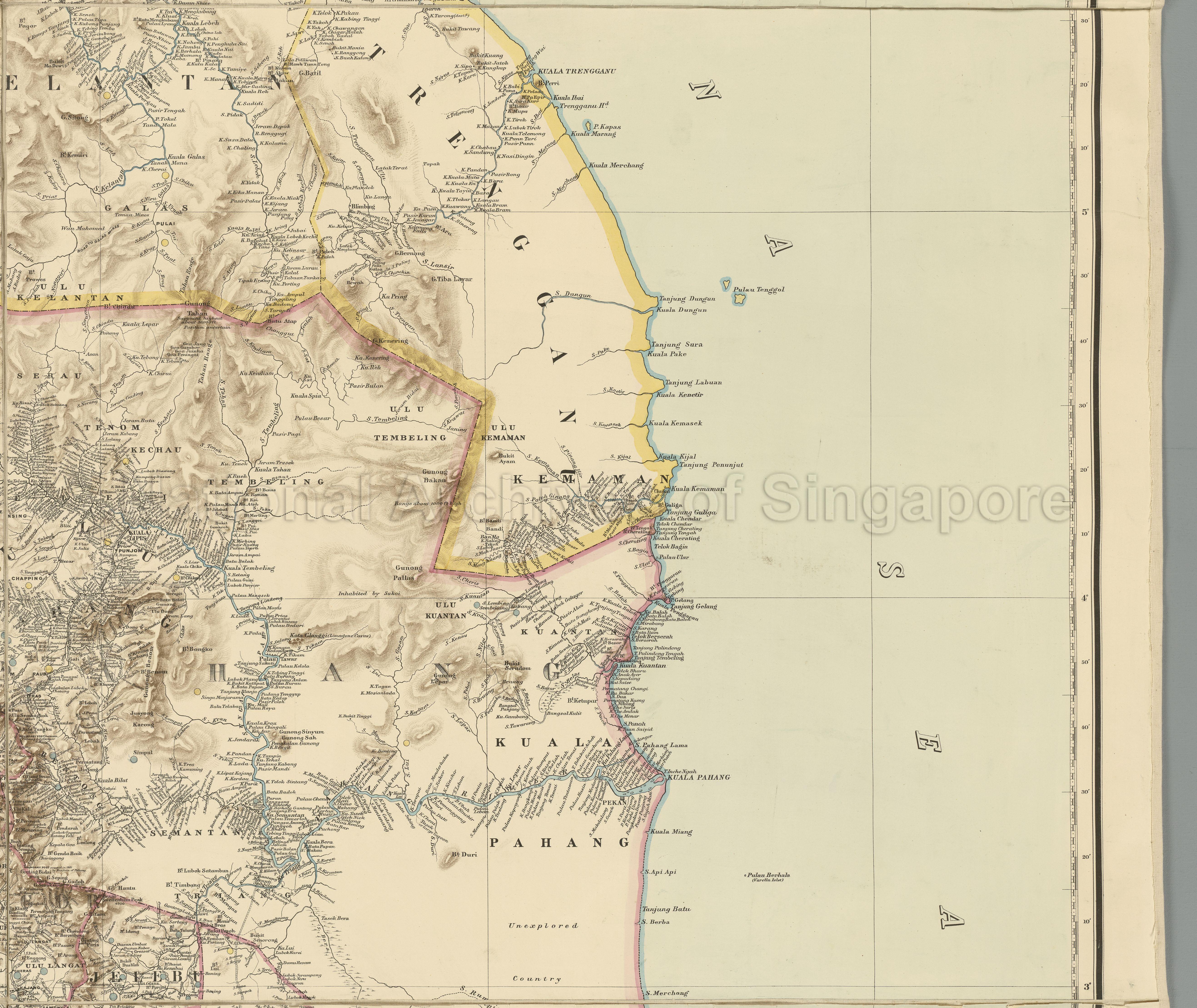 Map shows Siamese States (edged yellow) of Kelantan and Trengganu (presently States of Malaysia), and Federated Malay State under British Protection (edged pink) of Pahang, Selangor, Negri Sembilan and Sungai Ujong which subsequently became part of Negri Sembilan, all bordered by undefined boundaries, bridle roads and paths, proposed railways, rivers and streams, islands, gold and tin locations, highland shading, towns, kampongs, Pahang River (Sungei Pahang), Sungei Trengganu, Sungei Kelantan, Gunong Tahan (position uncertain), descriptions "Unexplored Country" and "Inhabited by Sakai" in Pahang, Pekan, Kajang, Raub, Kuala Lipis and others.