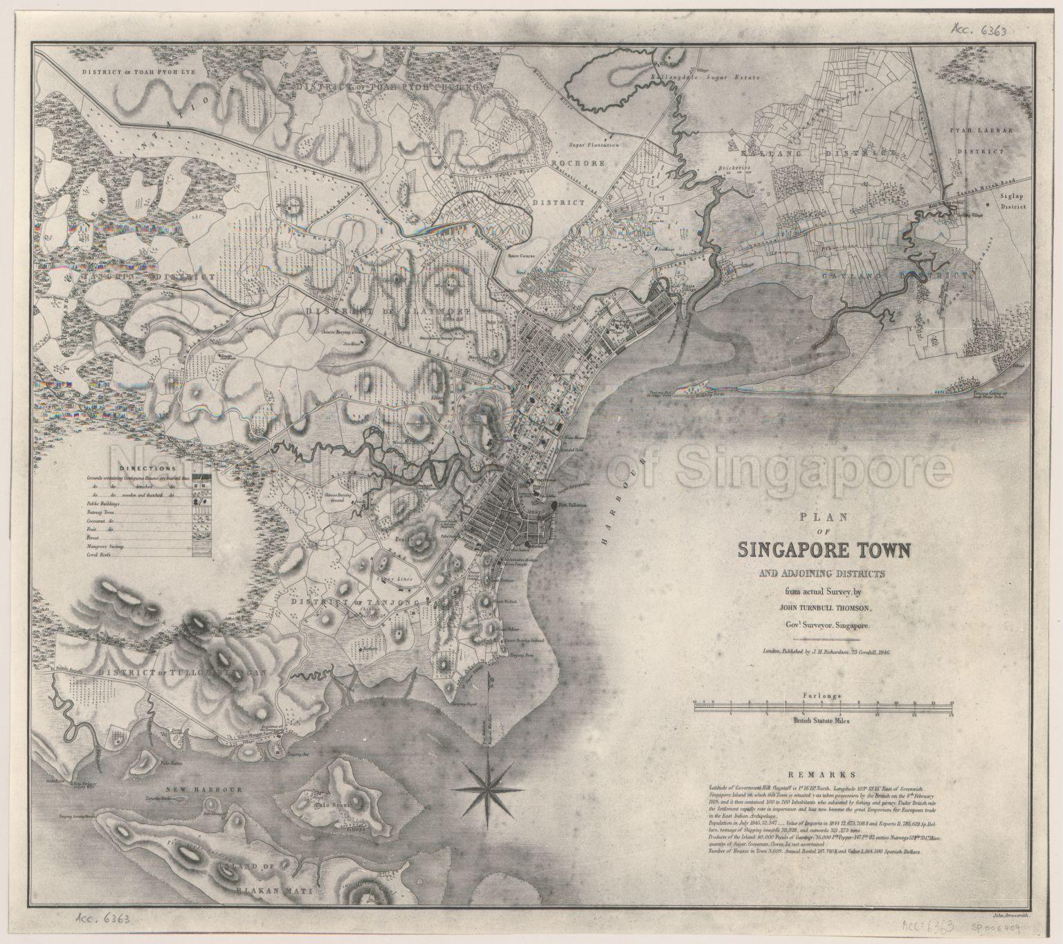 This map shows the demarcation and development of Singapore town and the land use of its adjoining districts. This is the most detailed map of Singapore’s town of the time that is known (two editions 1844 and 1846).