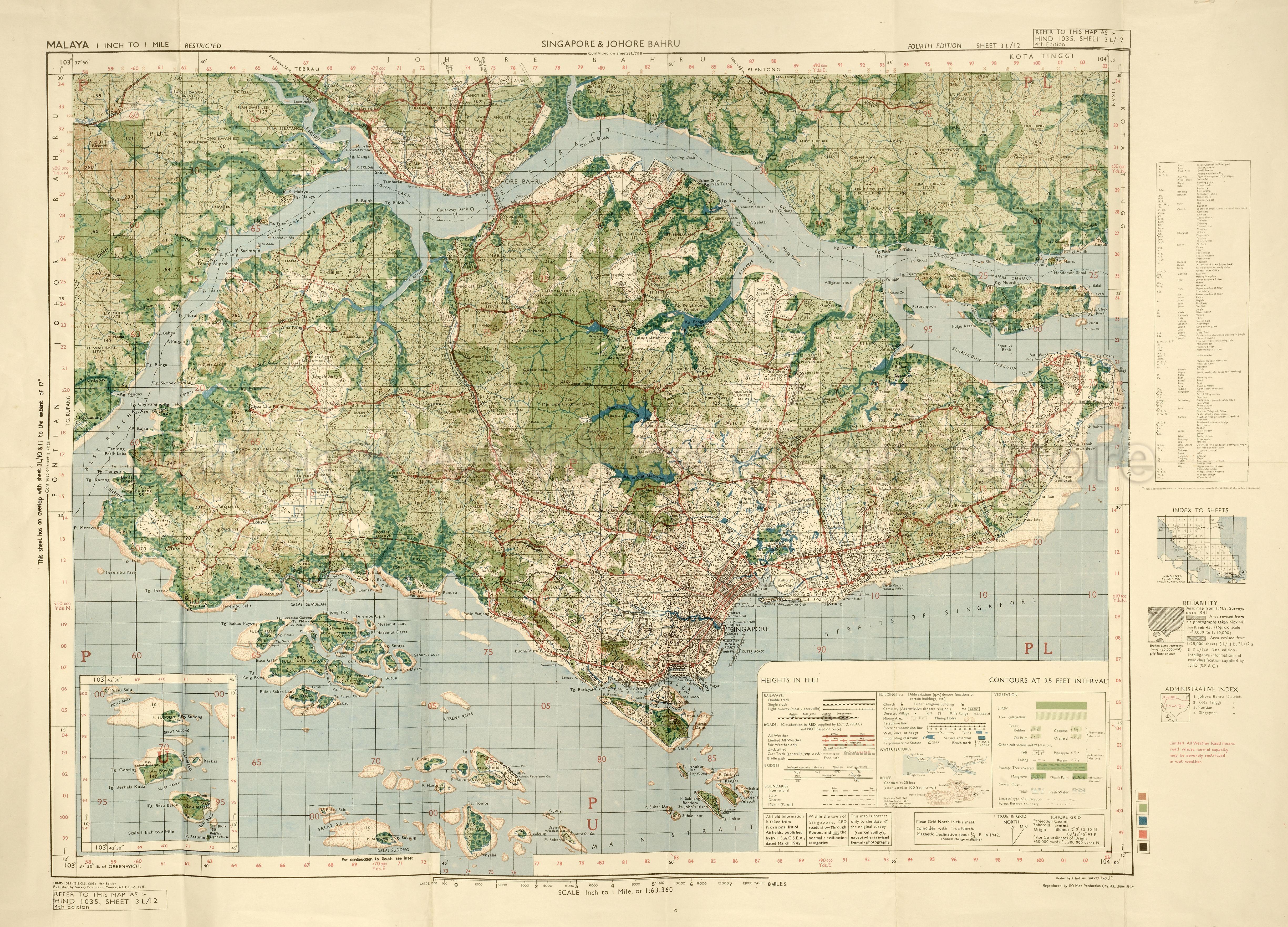 Map shows contours, physical landscape, forest reserves, vegetation, rubber plantations, coconut plantations, pineapple plantations, oil palm plantations, buildings, villages, airfields, reservoirs, rocky outcrops, sandbanks, quarries, swamps, main roads, railway connecting to the Causeway, rivers, islands, and others.