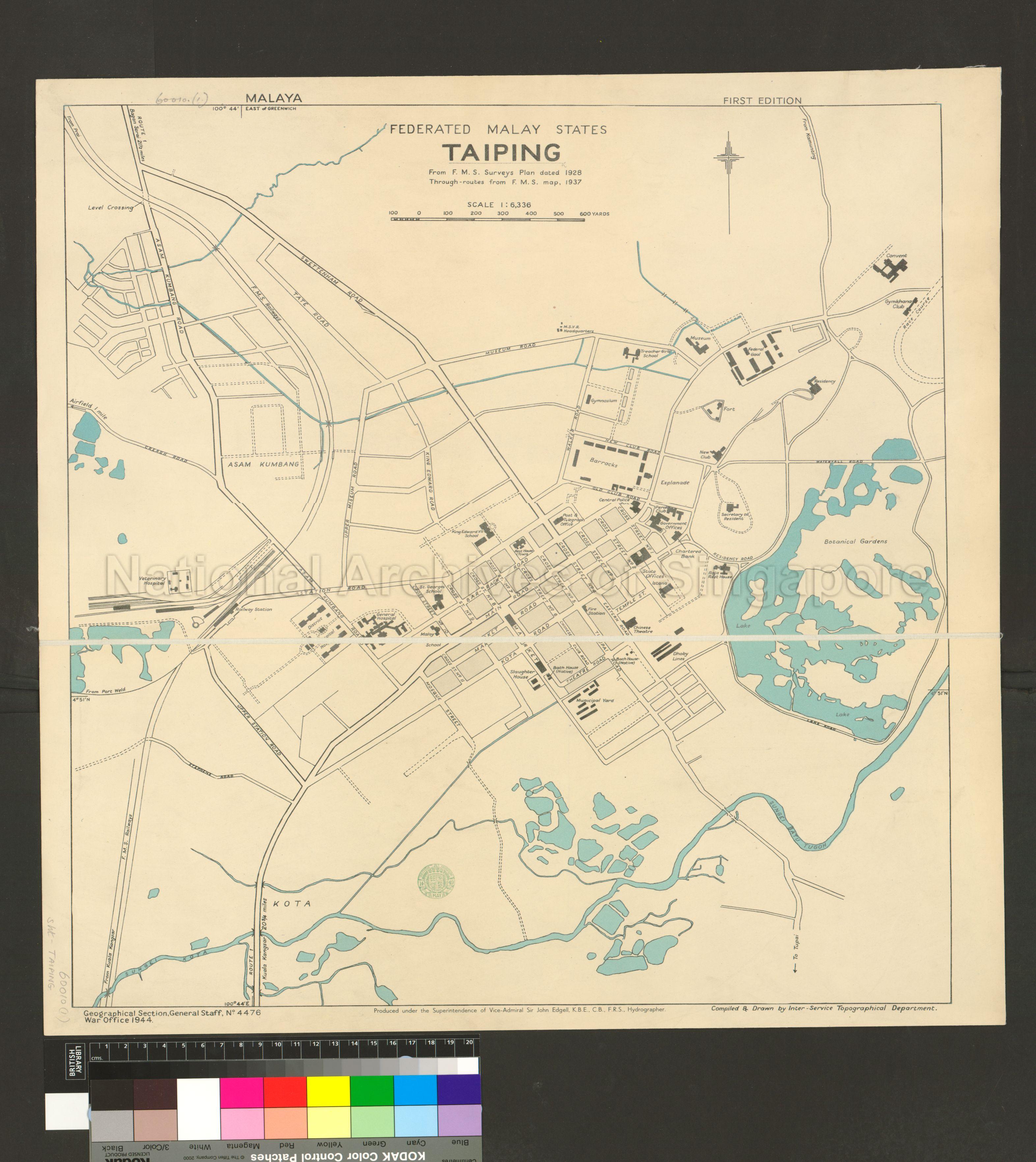 Map showing road system, buildings, Asam Kumbang Road, Swettenham Road, F.M.S. Railways, Veterinary Hospital, Sungei Kota, Upper Station Road, Sungei Batu Tugoh, Botanical Gardens, Lakes, Secretary to Resident, Istana, Raja Rest House, Convent, Museum, Barracks, King Edward VII School, Perak Club, General Hospital, St Georges School, Main Road, Temple Street and others