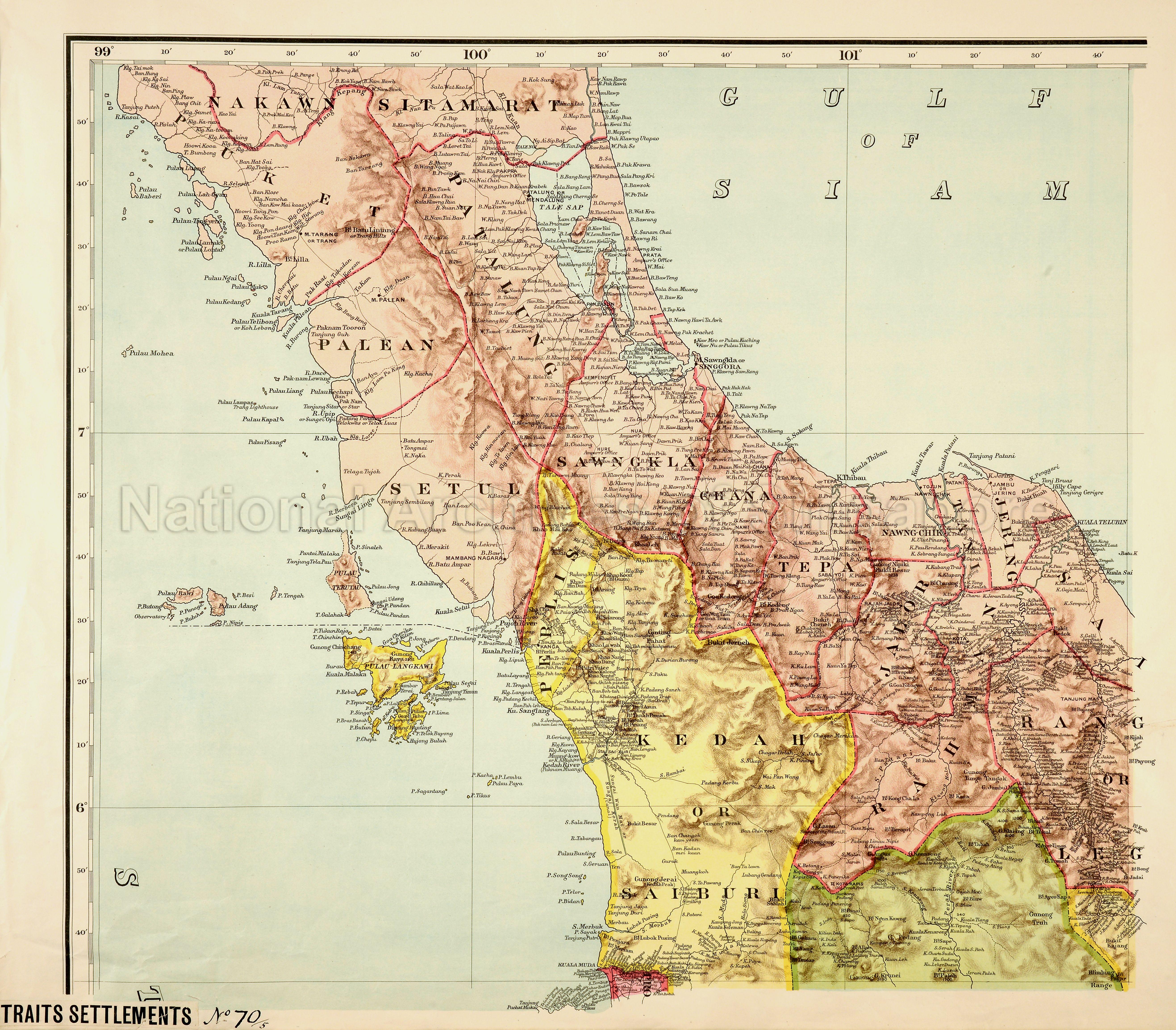 Map of the Malay Peninsula compiled by and published for the Straits Branch of the Royal Asiatic Society, Singapore 1911. Scanned in 6 sheets. A list of English, Malay and Siamese geographical terms provided in a table entitled "Synopsis of Native Terms". Edward Stanford Ltd.
