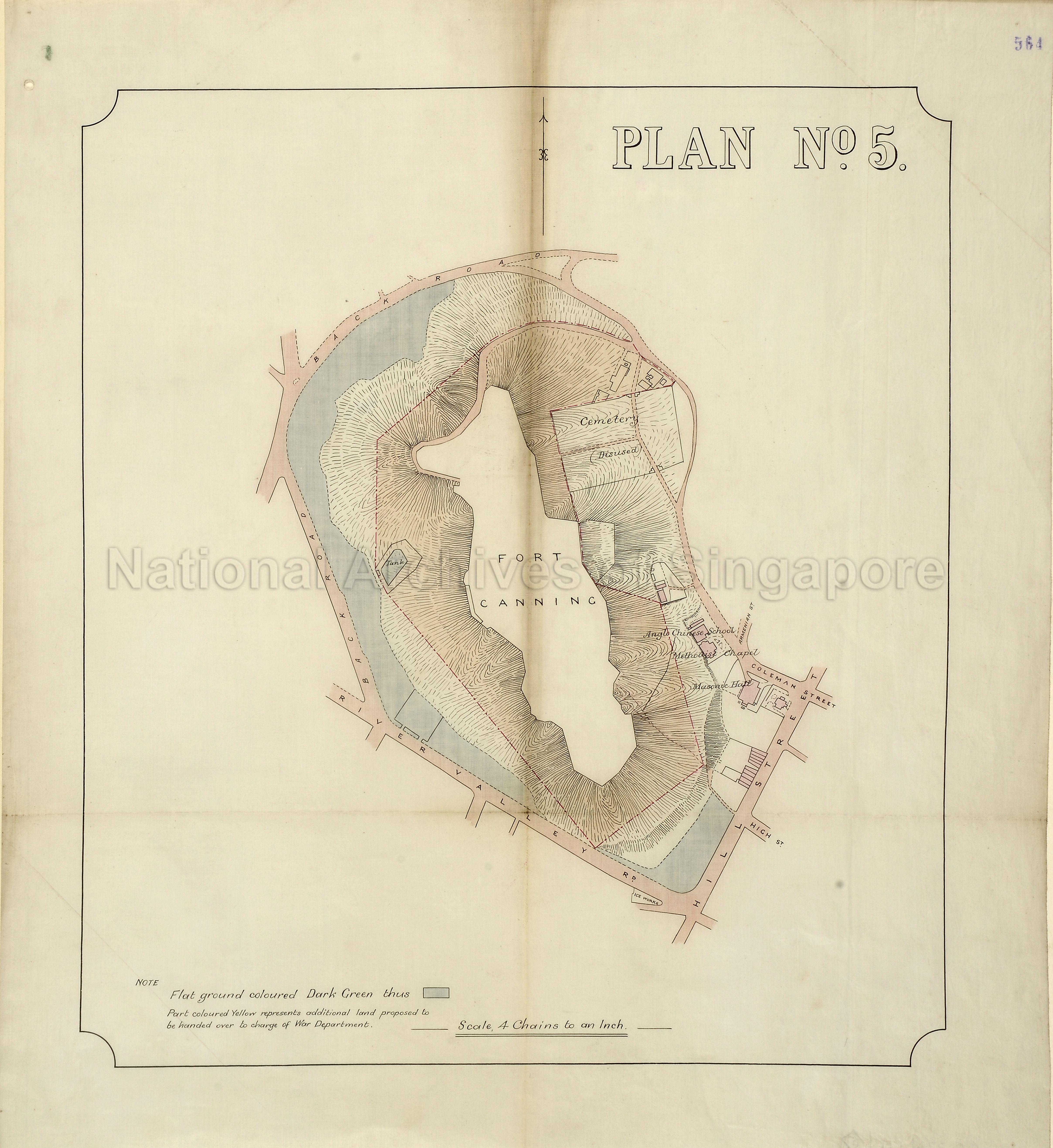 Plan no.5. Fort Canning and surrounding areas bounded by River Valley Road, Back Street, Coleman Street and Hill Street. Plan shows additional land to be handed over to the charge of War Department. From public record Office: Maps and plans extracted to flat storage from various series of records of the Colonial Office.