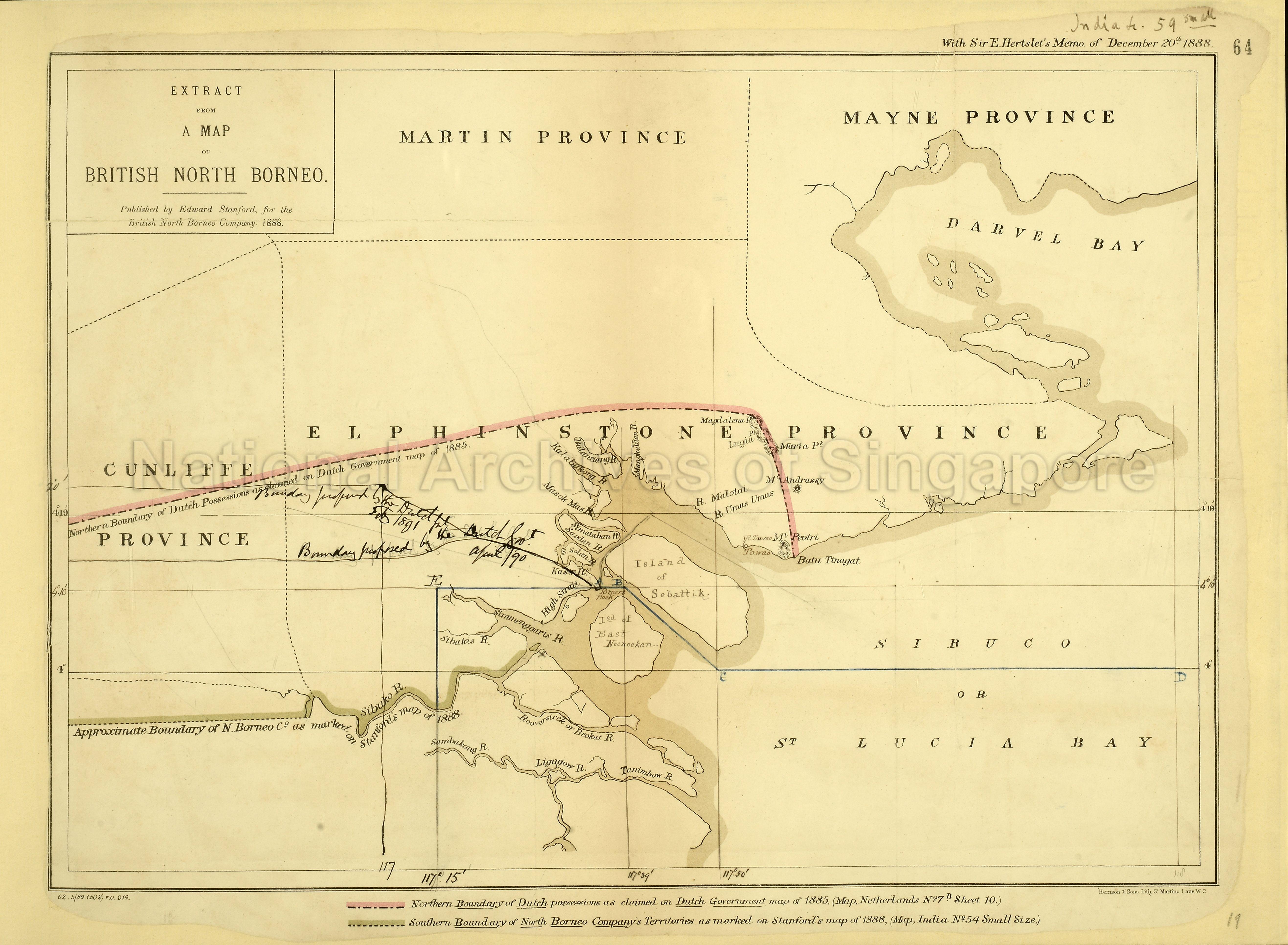 Extract from a map of British North Borneo. Published by Edward Stanford for the British North Borneo company. Enclosed with Sir E. Hertslet's memo of 20 December 1888. (no.64)From public record Office: Maps and plans extracted to flat storage from various series of records of the Foreign Office. This series contains maps, charts, plans, and a small number of architectural and technical drawings, all extracted from various records created or accumulated by the Foreign Office (FO).