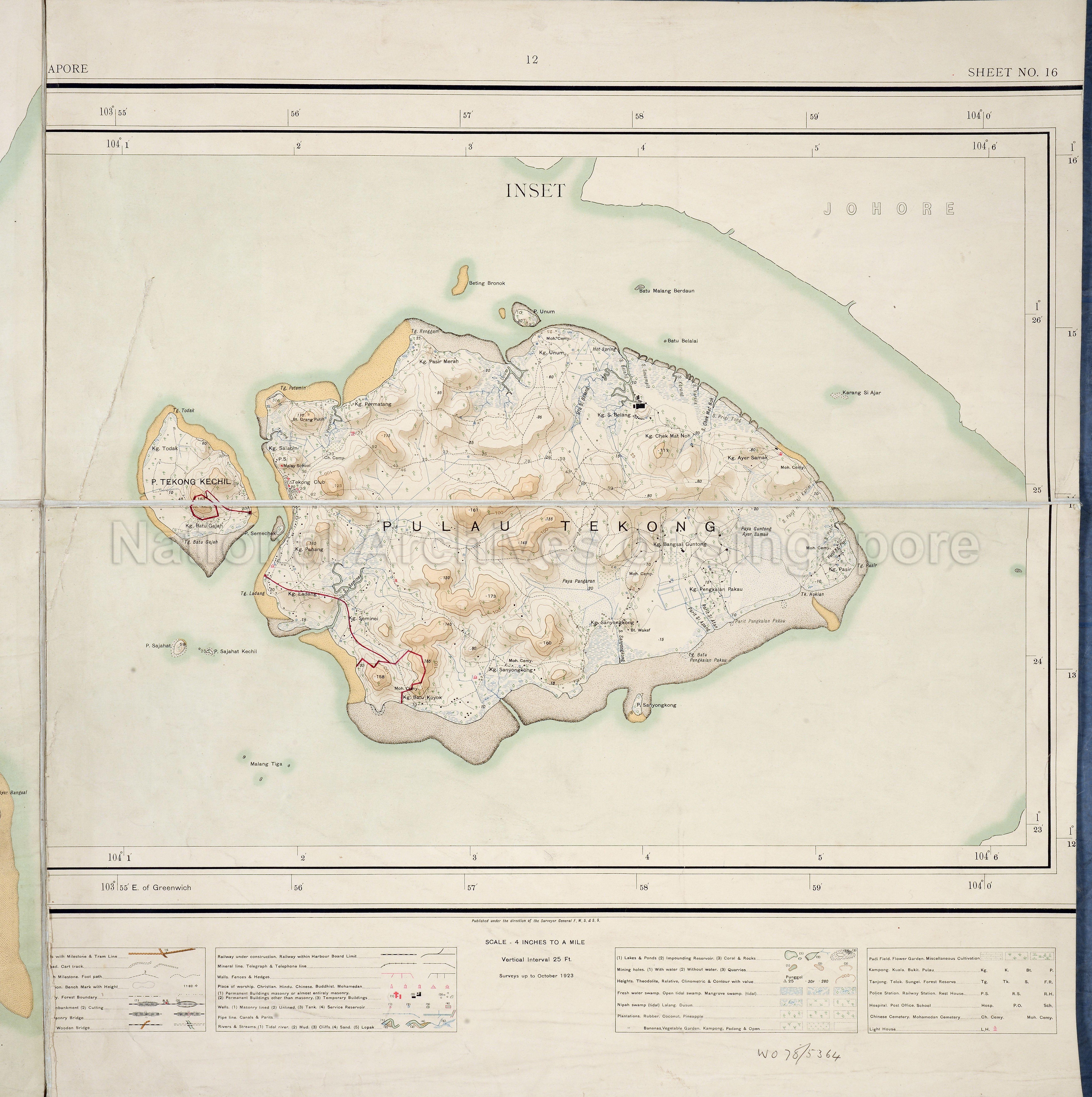 A large scale survey map of Singapore divided into 16 parts. Part 5 shows Pulau Tekong in an inset.
