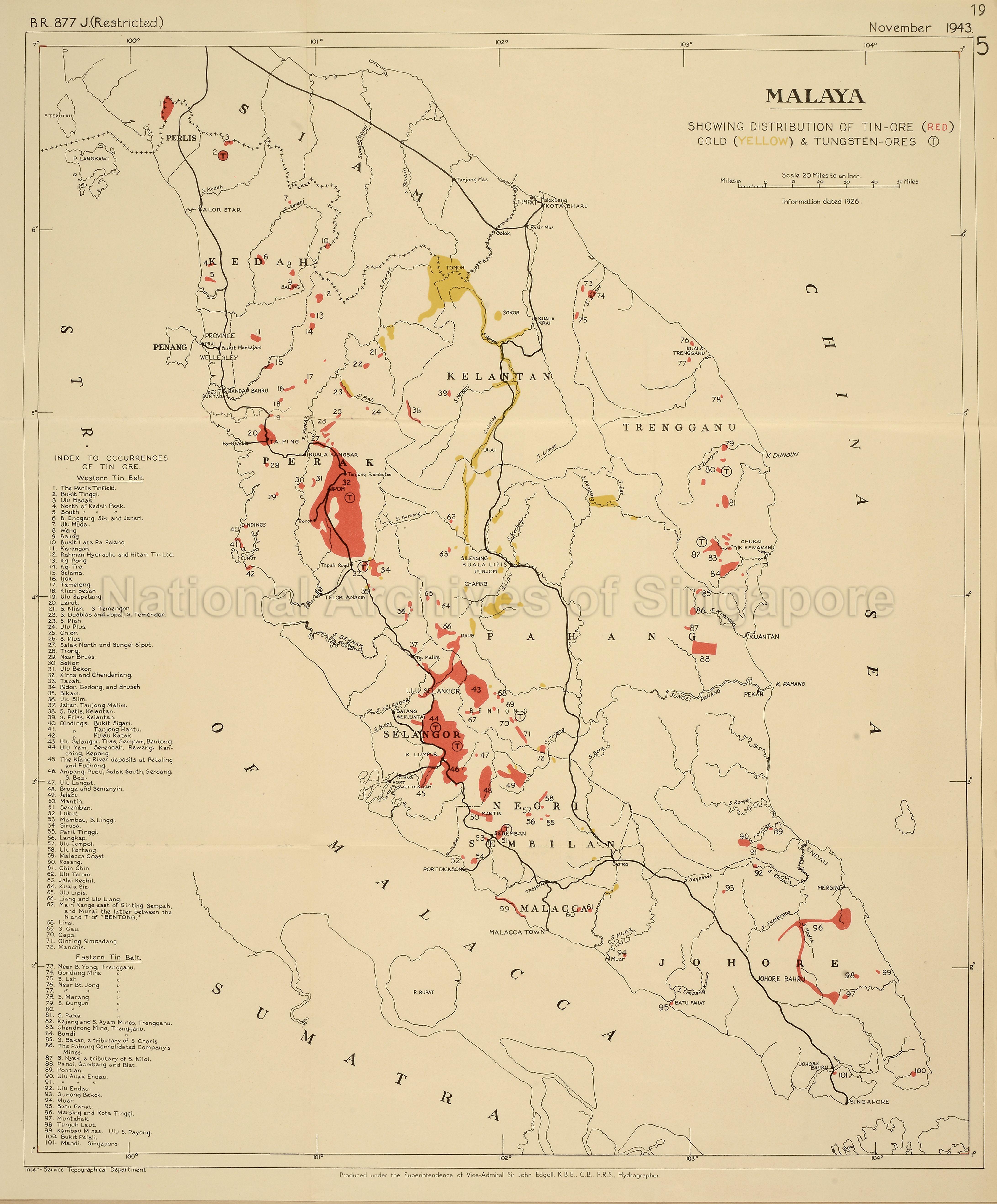 Sketch map of Malaya showing distribution of tin, gold and tungsten ores. From Admiralty, Inter-service Topographical Department, and Ministry of Defence, Joint Intelligence Bureau Library: Surveys, Maps and Reports. Plans: 1-30.