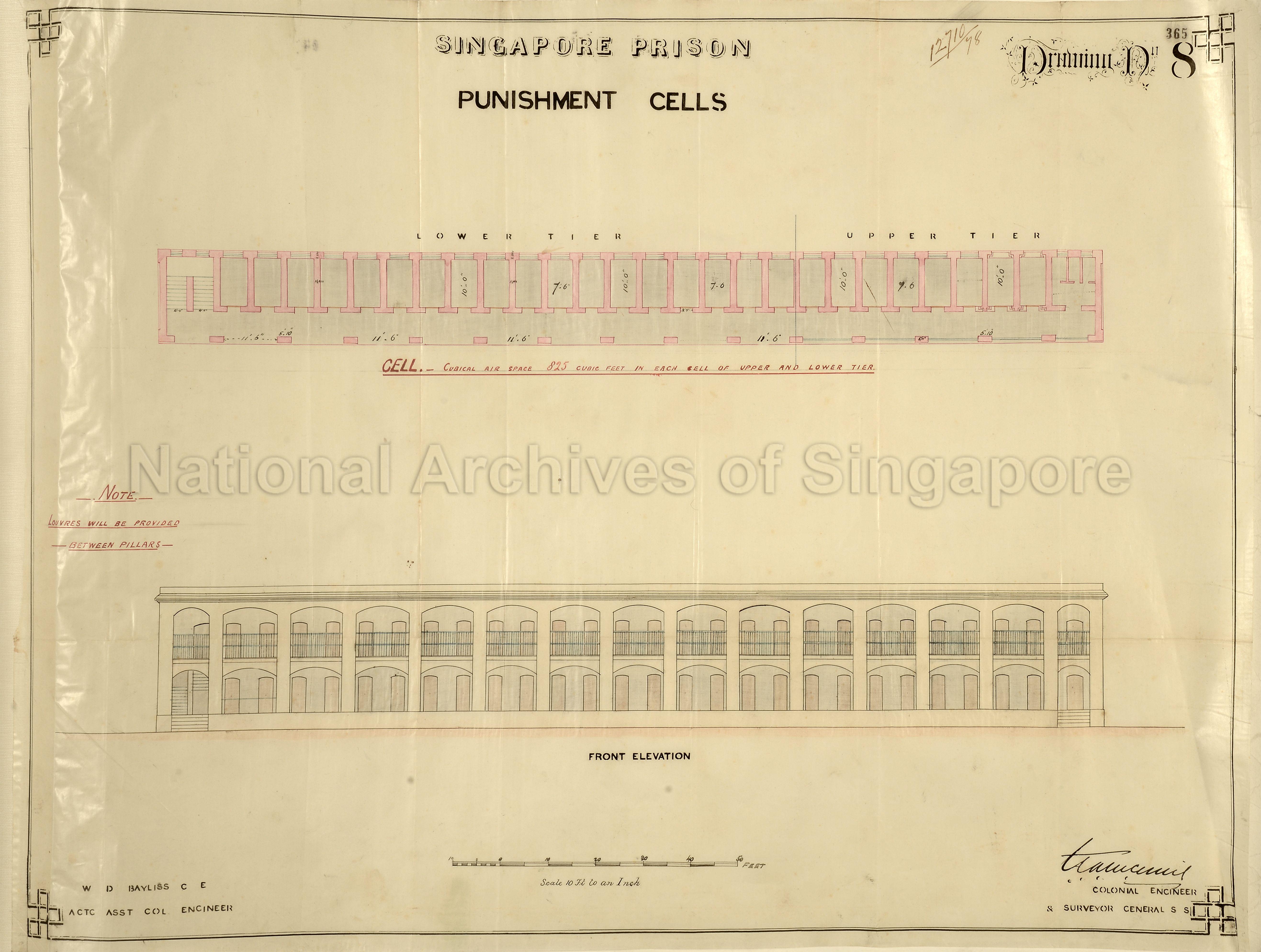 Singapore Prison: plan of punishment cells in upper and lower tiers. Includes a front elevation plan. From public Record Office: Maps and plans extracted to rolled storage from records of various departments. 10 items extracted from CO 273/95 (folios 358-368). Straits Settlements: Singapore.