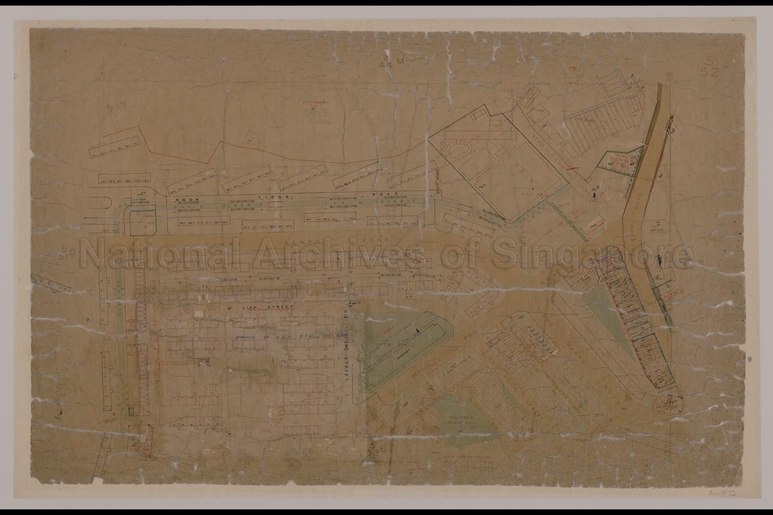 Plan shows land division, markings showing Singapore Improvement Trust Land and Municipal Commission Land, buildings, building plan numbers, drain reserves, land reserved for public purposes, backlanes, public street, open space, children's playing field, market, Chinese temple and others, in areas bordered by Tiong Bahru Road, Lim Liak Street, Seng Poh Road, Eng Watt Street, Eng Hoon Street, Beng Gum Road, Outram Road and the surroundings