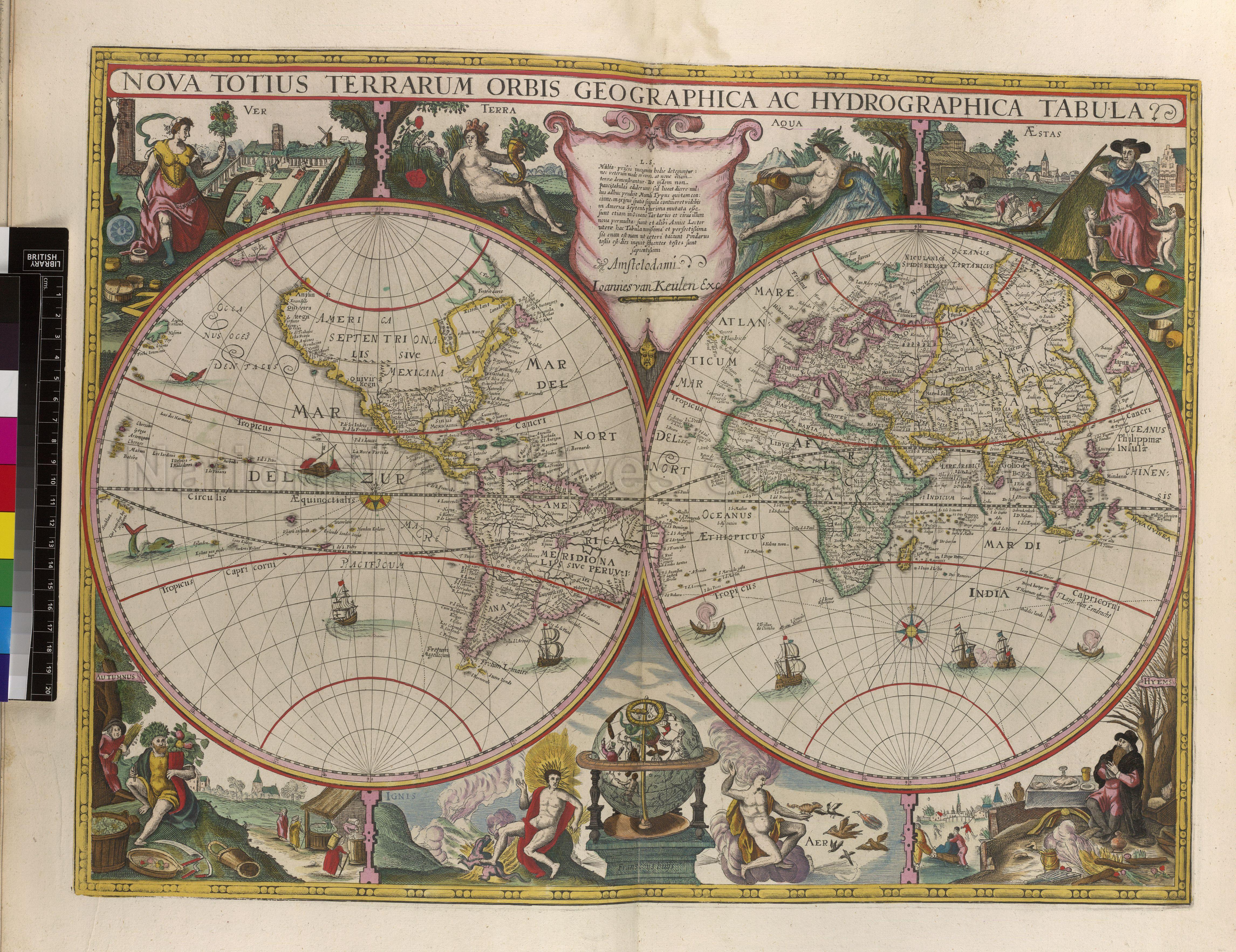 This coloured world map in two hemispheres is in Latin with title translated as 'New World Map, Geographic and Hydrographic Board'. It shows the oceans and continents of North America, South America, Europe, Africa and Asia, with their coastlines and other geographical features, only part of the coastline of western Australia, islands, seas, lakes and rivers, mountains in pictorial form, country names, place names, cities, towns, part of Great Wall, England, France, Spain, Germany, Russia, Tartary, China, Japan, Korea wrongly depicted on an island, India, Persia, Arabia, Libya, London, Paris, Madrid, Lisbon, Rome, Constantinople, Vienna, Jerusalem, Cairo, Malacca, Canton, Macao, Mexico, Sumatra, Java, Borneo, Celebes, Philippines Islands, and others. The map is decorated with coloured drawings of scenes, figures, articles and others at the top and bottom.