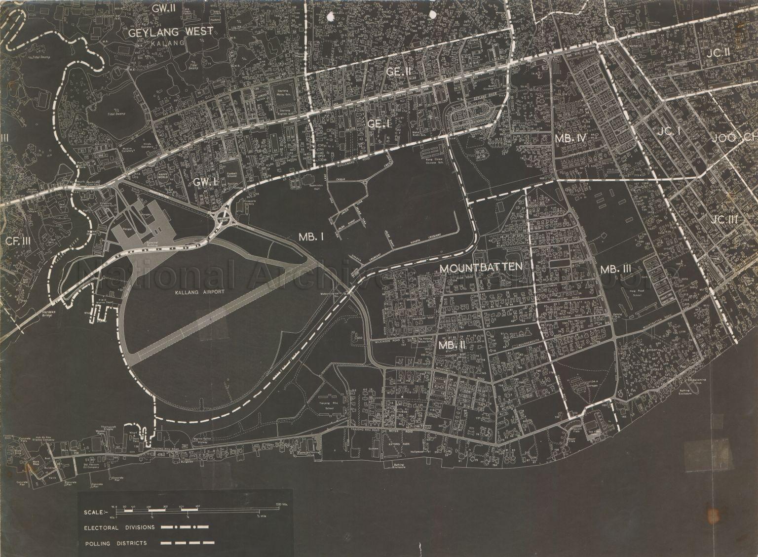 Map covers part of division of Geylang West fringing the electoral division of Mountbatten showing electoral divisions boundary, polling districts boundary, buildings, proposed houses, housing estates, hotels, villages, markets, roads, proposed roads, cemeteries, schools, rivers, bridges, godowns, piers, swamps, factories, clubs, bathing enclosures, swimming pool, floating docks, garages, workshops, saw mills, sago factories, pineapple factories, government bungalows, Hindu temples, Sea View Hotel, Embassy Hotel, Meyer Flats, Crescent Flats, Kampong Kuchai, Kampong Amber, Singapore Swimming Club, Tanjong Rhu Club, Standard Vacuum Oil Company, Hoh Ah Kow Slipway Company, Thornycroft Slipway, Marine Police Slipway, Kallang Airport, Tanjong Rhu School, Kong Chiaw Chinese School, Public Works Department Marine Depot, Merdeka Bridge, Sir Arthur's Bridge, Meteorological Station, Badminton Hall, Happy World, Hindu cemetery, Muslim Cemetery, Guillemard Circus, and others.