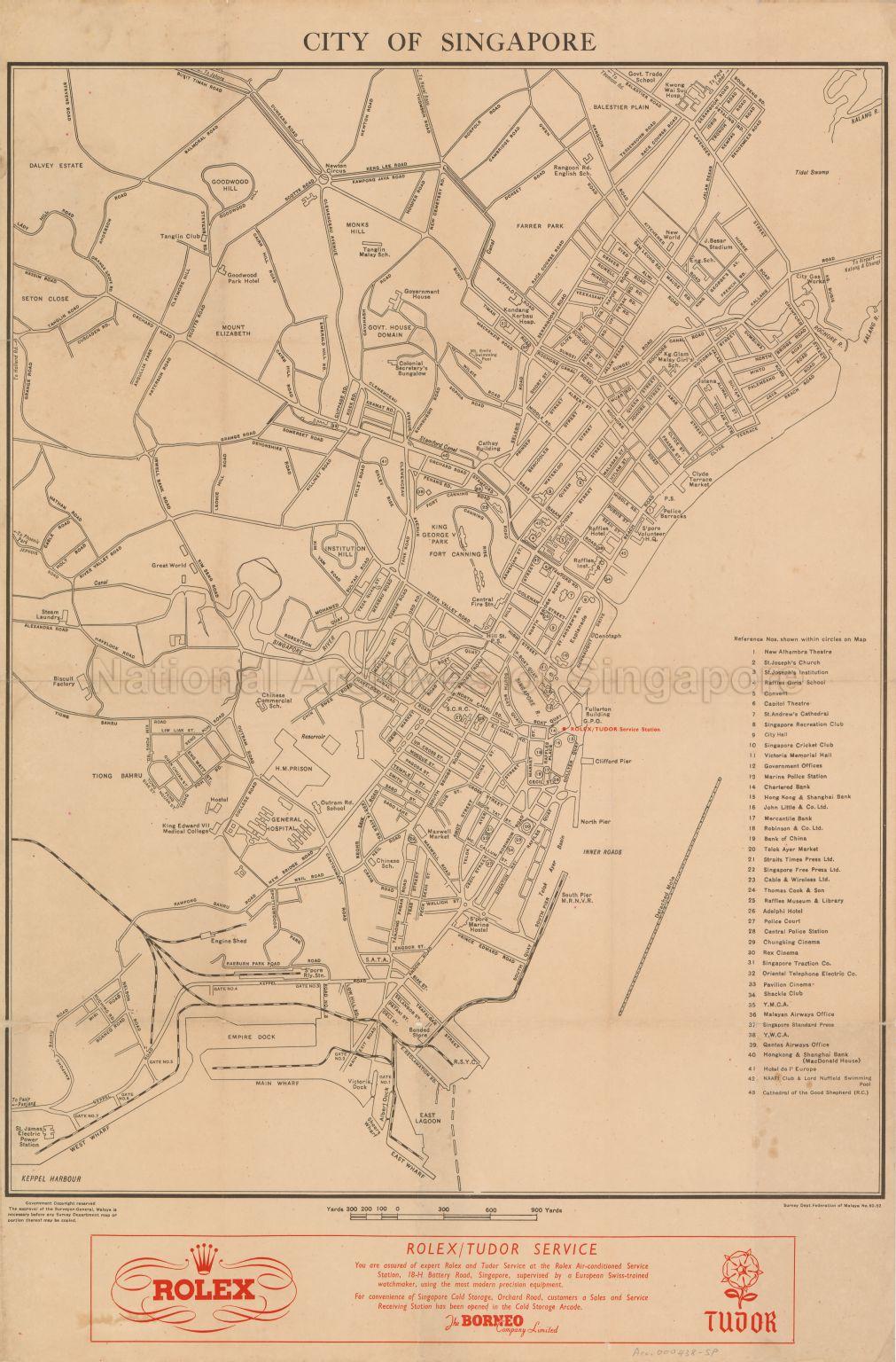Map covers the city area showing major places, private buildings, housing estates, cinemas, clubs, hospitals, hotels, monuments, playground, parks, government buildings, prisons, markets, roads, railway line, reservoirs, piers, lagoons, docks, wharves, biscuit factory, steam laundry industry, schools, and rivers such as Raffles Hotel, Goodwood Park Hotel, Maxwell Market, Clyde Terrace Market, Raffles Institution, King George V Park, Farrer Park, Fort Canning, Balestier Plain, Government House Domain, Dalvey Estate, Great World, New World, Cathay Building, Cenotaph, City Gas Works, General Hospital, Kwong Wai Sui Hospital, Rex Cinema, Pavilion Cinema and others. The location of Rolex/Tudor Service Station is indicated in red and advertisement banner printed in red at bottom of map.