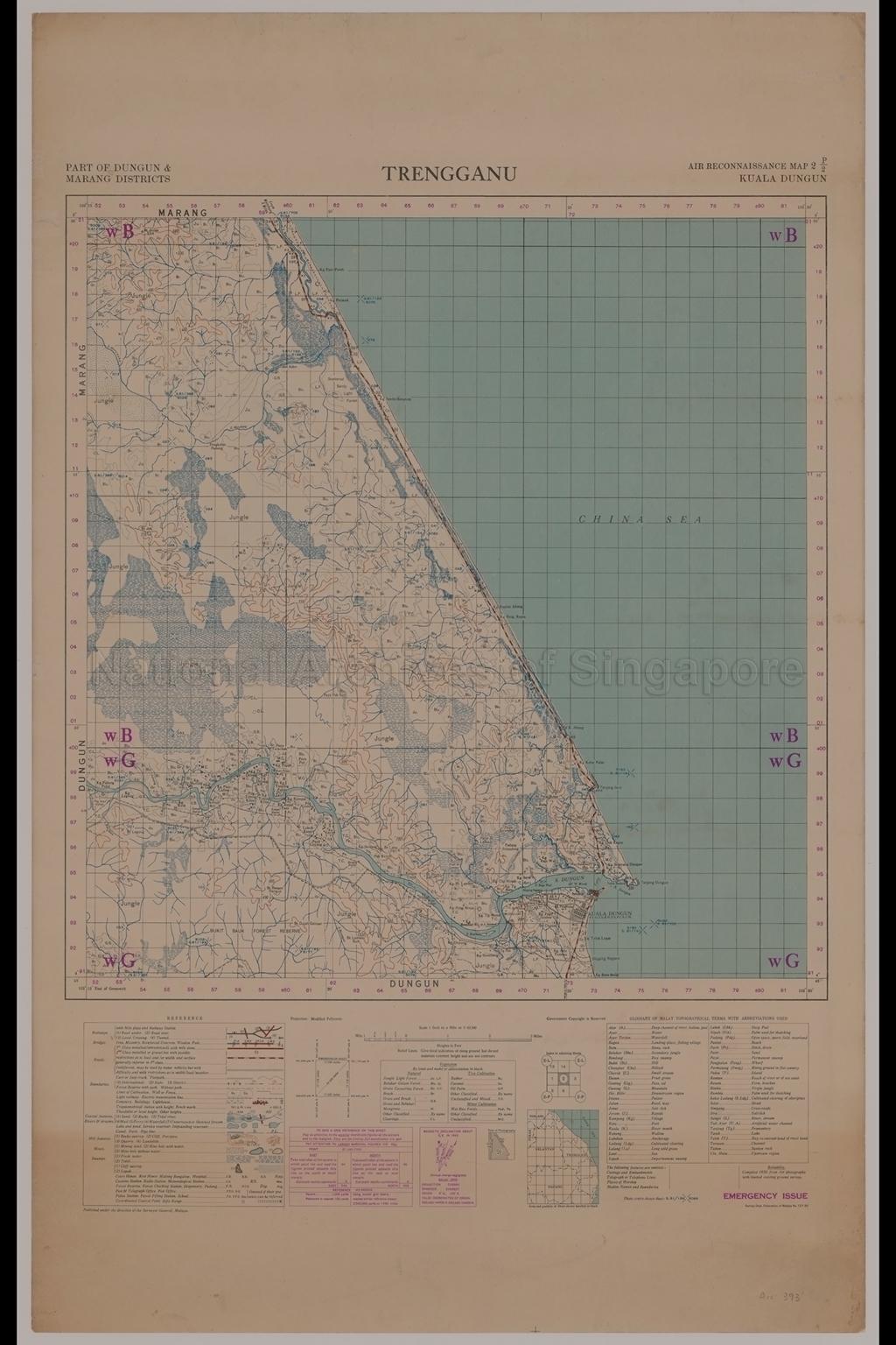 Map covers parts of Dungun and Marang Districts in Trengganu, Malaya showing coastline fronting (South) China Sea, physical landscape, land use, buildings, kampongs, coastal gravel road, roads, tracks, footpaths, spot heights, trigonometrical stations, rivers, streams, swamps, coconut cultivations, tree cultivations, minor cultivations, belukars (light forests or secondary jungles), jungles, Bukit Bauk Forest Reserve, Sungei Merchang, Sungei Dungun, and others