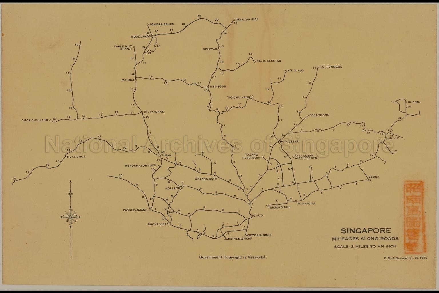 This map measures the distance of key landmarks and districts across Singapore Island, taking the General Post Office in the Fullerton Building at Empress Place as its zero point. The Japanese stamp on the lower right hand corner of the map belonged to the Syonan-To library (which was the Raffles Library and Museum during the Occupation)
