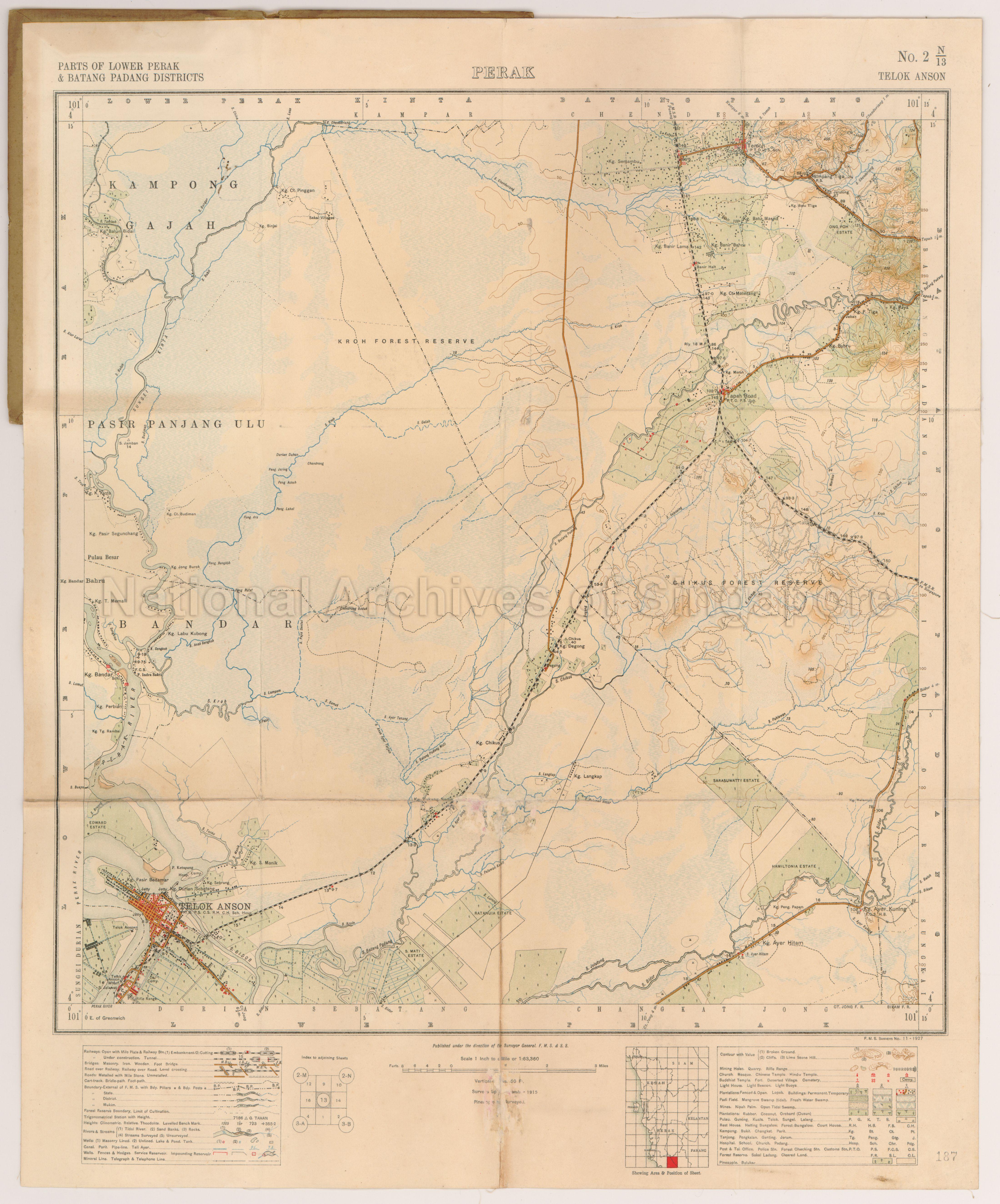 Malaya Topographical Survey Sheet 2 N_13 covers parts of Lower Perak and Batang Pandan Districts in Perak, Malaya in 1915 showing contours, physical landscape, land use, kampongs, plantations, rivers, roads, railway, Kampong Gajah, Pasir Panjang Ulu, Perak River, and others
