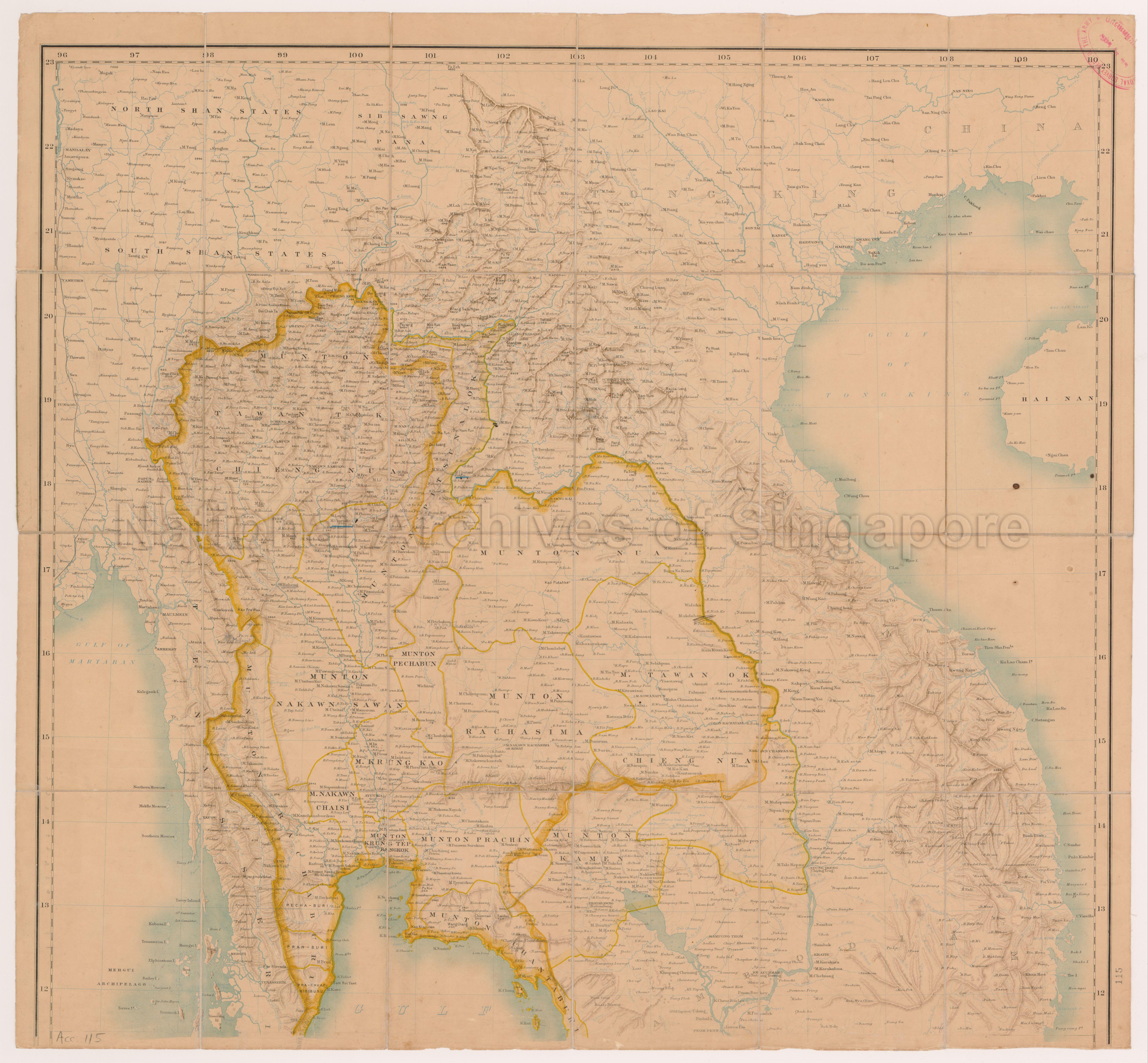 This is the top portion of the map which is in two parts covering the Kingdom of Siam (Thailand) with boundaries as at 1910 and its dependencies, showing Laos, parts of Burma (Myanmar), Vietnam and Kampuchea, towns, villages, highlands, rivers, provinces and others