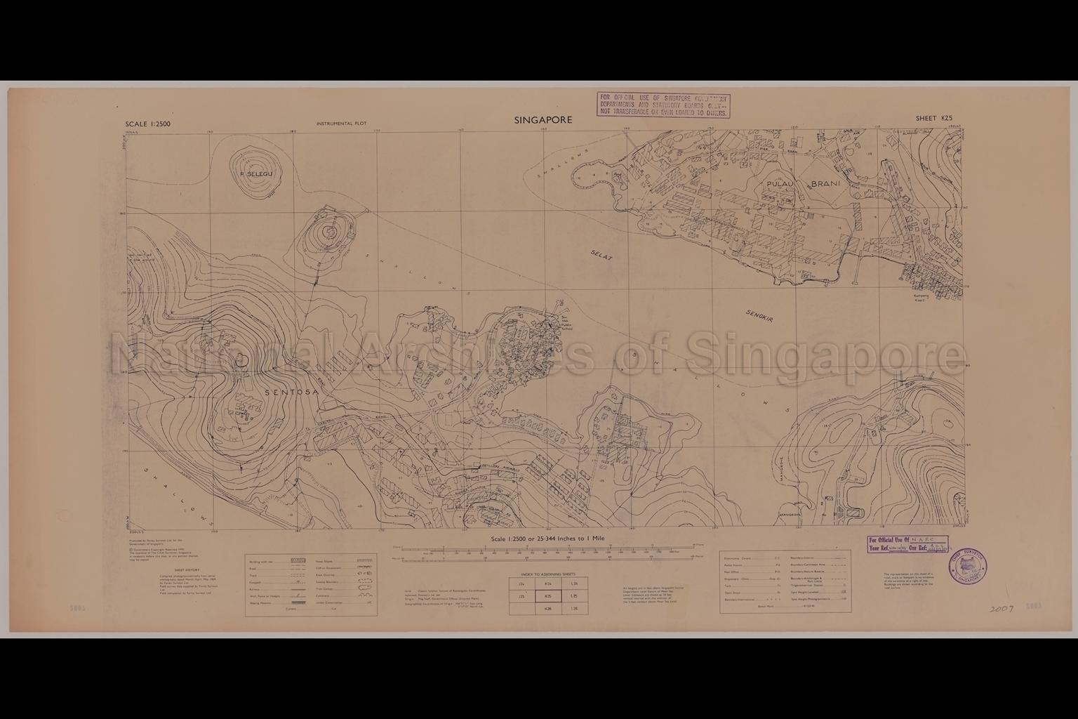 Map shows Selat Sengkir, Pulau Brani, Sentosa, Pulau Selegu, contours, buildings, school, mangrove swamps, ponds, Almond Hill, Kampong Kopit, Pier Road, Adur Avenue, Sin Wah Public School, Siloso Road, Carlton Hill Road, Jetty Road, Artillery Avenue, Bird Cage Walk, and others