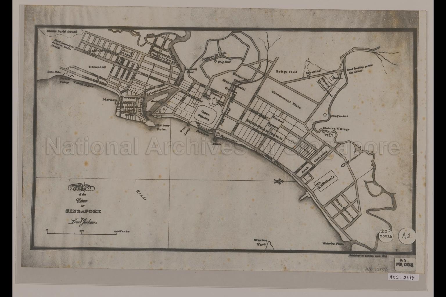 This proposed plan of Singapore Town prepared by Lieutanent Jackson in line was not actually executed. Map shows land division, Chinese burial ground, lime kiln, fishing village, market, mosque, watering place, pier, jetty, Chinese Kampong, Chuliah Kampong, Bugis Kampong, Dhobies Village, Kling Chapel, European Town, Singapore Hill, Selegie Hill, Rocher Square, Commercial Square, Open Square, Battery Point, Singapore River, Cantonment Plain, Botanical and Experimental Garden and others