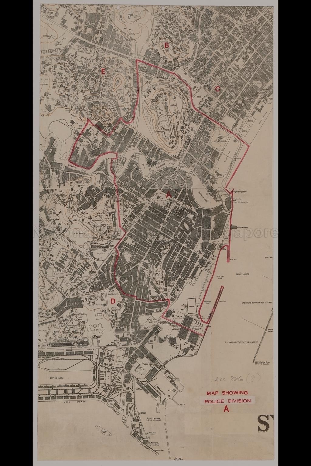 Map covers the city area showing Police Division A boundary edged in red, buildings, house numbers, railways, roads, private access roads, contours, churches, Chinese temples, Hindu temple, synagogue, chettiars temple, mosque, kramat, theatre, cinemas, schools, Chinese schools, Japanese school, convents, hospitals, markets, fish market, electric sub-stations, police stations, Mt. Emily Public Park and swimming pools, Eu Villa at Mt. Sophia, Institution Hill, Orchard Road Market, Salvation Army Headquarters, Government House in Government House Domain (Istana), sports grounds, Fort Canning, underground reservoir, barracks, light house, old cemetery, Malay cemetery, Jewish cemetery, godowns, play grounds, museum, Central Fire Station, Armenian Church, Central Police Station, Hill Street Police Station, Havelock Road Police Station, Tanjong Pagar Police Station, Registrar of Vehicles, Dai Toa (indicated on Cathay Building), Wesley Church, Amber Mansion, General Hospital, maternity hospital, M. C. infant welfare clinic, government outdoor dispensary, Sepoy Lines Golf Club and links, H.M Prison, reservoir at Pearls Hill, police parade ground, Sikh police barracks, Outram Road School, Pearls Hill School, Chinese Commercial School, Sepoy Lines Malay School, biscuit factories, groundnut oil factory, Wong Lan Son Orphan Free School, A. P. oil tanks, gas tank, Maxwell Road Market, Telok Ayer Market, Empire Cinema, Police Court, Fullerton Building, Chartered Bank, Meyer Chambers, Bank of China, Ocean Building, John Little, Arcade, Change Alley, Union Building, Yamato Sanboshi (Clifford Pier), police quarters, Traffic Office, Eng Aun Factory, General Rubber Co., stadium, government quarantine station, Victoria Hotel, Singapore Marine Hostel, P. W. D. Office, Kubetu Si (printed on City Hall), St Andrew's Cathedral, St Joseph's Church, Kokeido (printed on Victoria Memorial Hall), Singapore (Tanjong Pagar) Railway Station, Spottiswoode Park, S.H.B. police quarters, Empire, Victoria and Albert Docks, East Lagoon, Telok Ayer Basin, main wharf, east wharf, piers, Stamford Canal, Singapore River, Pulau Saigon, Anderson, Cavenagh, Elgin, Coleman, Read, Ord, No. 1 and No. 2 Bridges, M.O. pipe line, Fullerton Square, Raffles Place, Collyer Quay, St. Andrew's Road, Connaught Drive, Cecil Street, Robinson Road, Chulia Street, Telok Ayer Street, Canal Road, North Canal Road, South Canal Road, North Bridge Road, South Bridge Road, Pickering Street, Upper Pickering Street, Cross Street, Upper Cross Street, Market Street, Eu Tong Sen Street, Maxwell Road, Neil Road, Keppel Road, Anson Road, Tanjong Pagar Road, New Market Road, Cantonment Road, Hospital Road, Outram Road, Prince Edward Road, Main Exit Road, East Reclamation Road, Trafalgar Square, Kreta Ayer Road, Club Street, Amoy Street, Japan Street, Duxton Road, Duxton Hill, New Bridge Road, Hill Street, Armenian Street, Queen Street, Waterloo Street, Bencoolen Street, Havelock Road, Chin Swee Road, Boat Quay, Clarke Quay, Roberson Quay, River Valley Road, High Street, Coleman Street, Stamford Road, Bras Basah Road, Beach Road, Middle Road, Rochore Road, Rochore Canal Road, Albert Street, Princep Street, Selegie Road, Short Street, Wilkie Road, Sophia Road, Dhoby Ghaut, Penang Road, Clemenceau Avenue, Fort Canning Road, Orchard Road, Emerald Hill Road, Killiney Road, Somerset Road, Devonshire Road, Grange Road and others