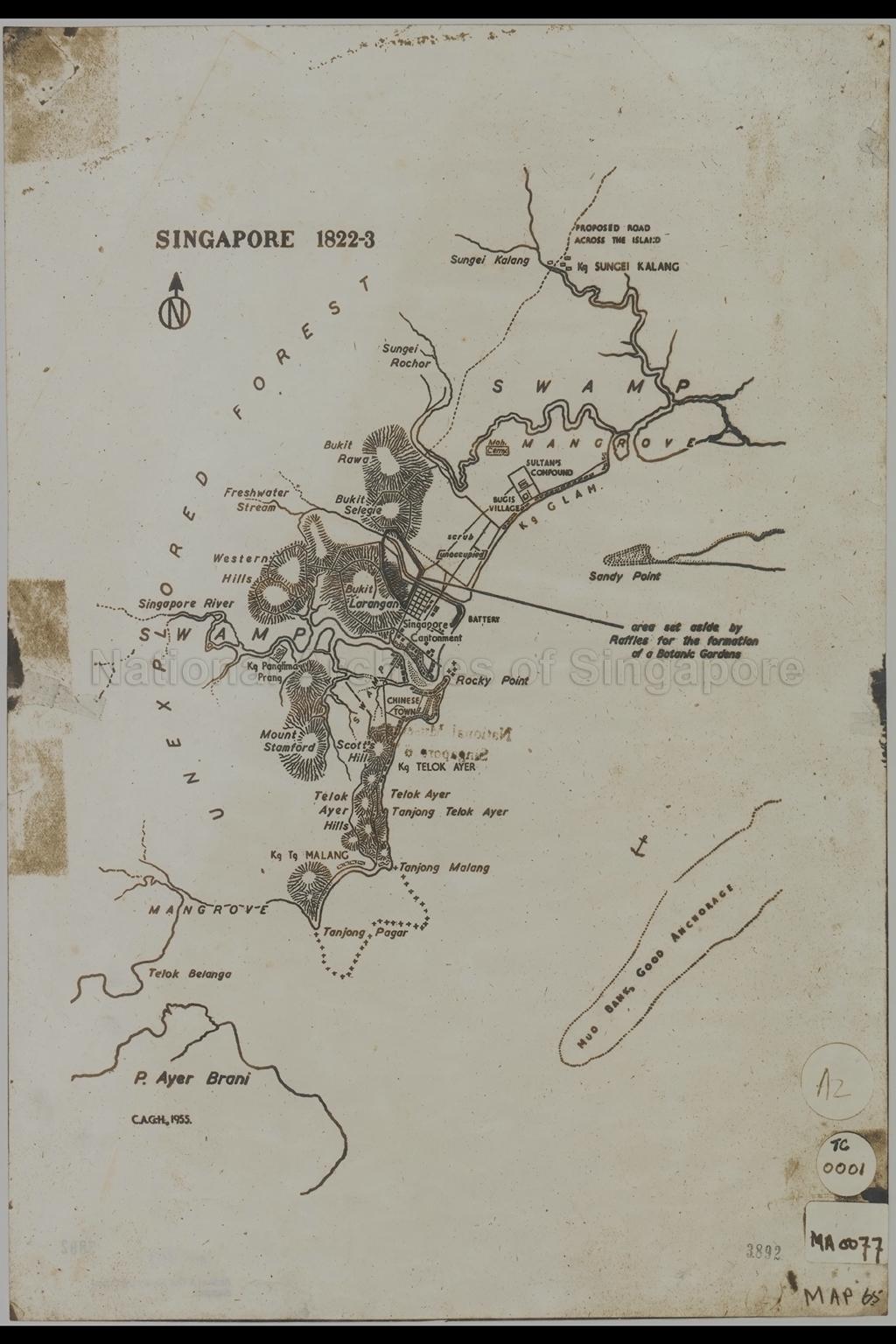 Part of Singapore town and Pulau Ayer Brani showing physical landscape, rivers, hills, villages, unexplored forest, swamps, sandy point, anchorage, an area set aside by Raffles for the formation of a Botanic Garden, and others.