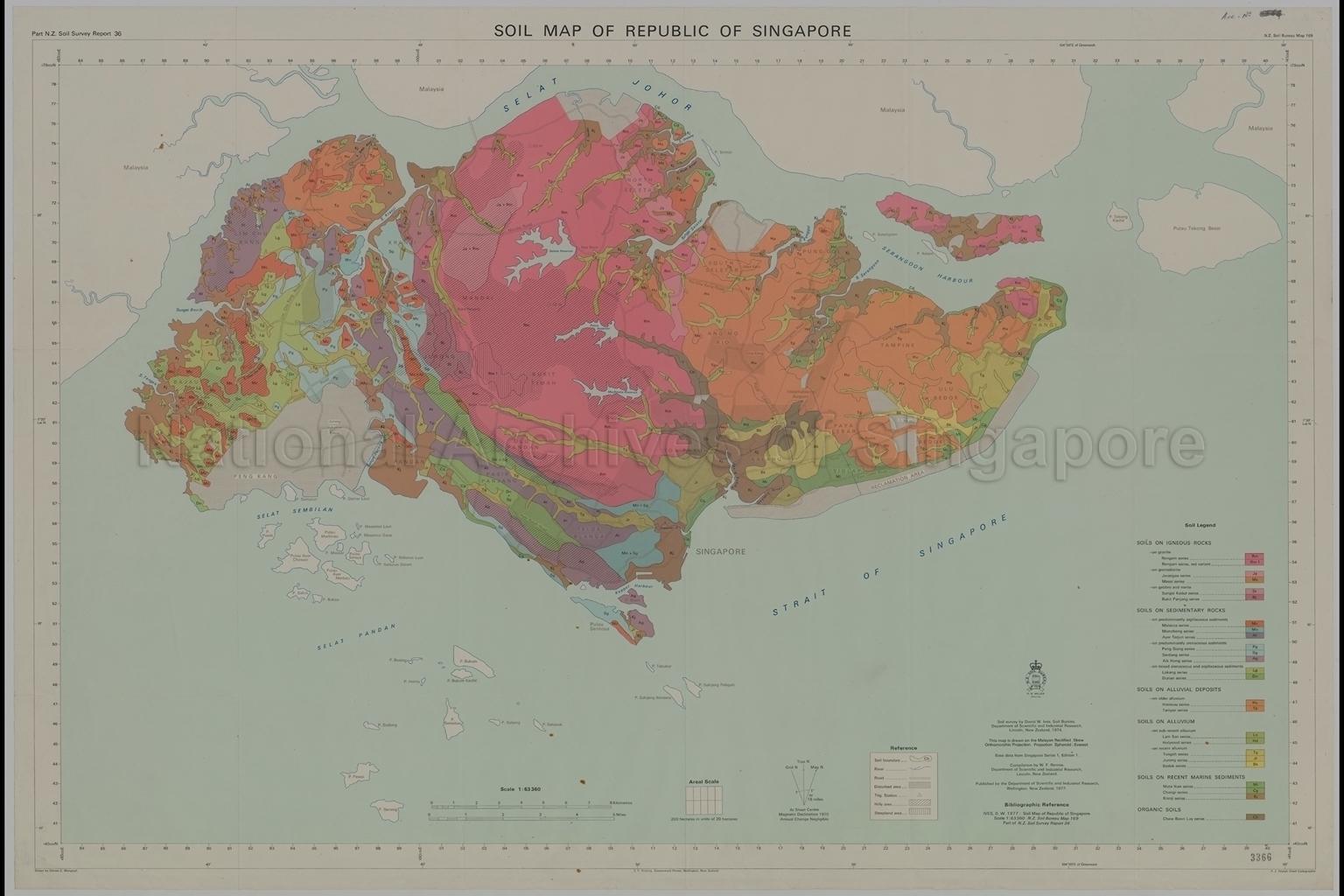 Coloured map of Singapore, and its surrounding islands, showing the various soil types (soils of igneous rocks, sedimentary rocks, alluvial deposits, alluvium, marine sediments and organic), places, trigonometrical stations, main roads, reservoirs, rivers, Jurong Industrial Estate, reclamation area, international airport and others