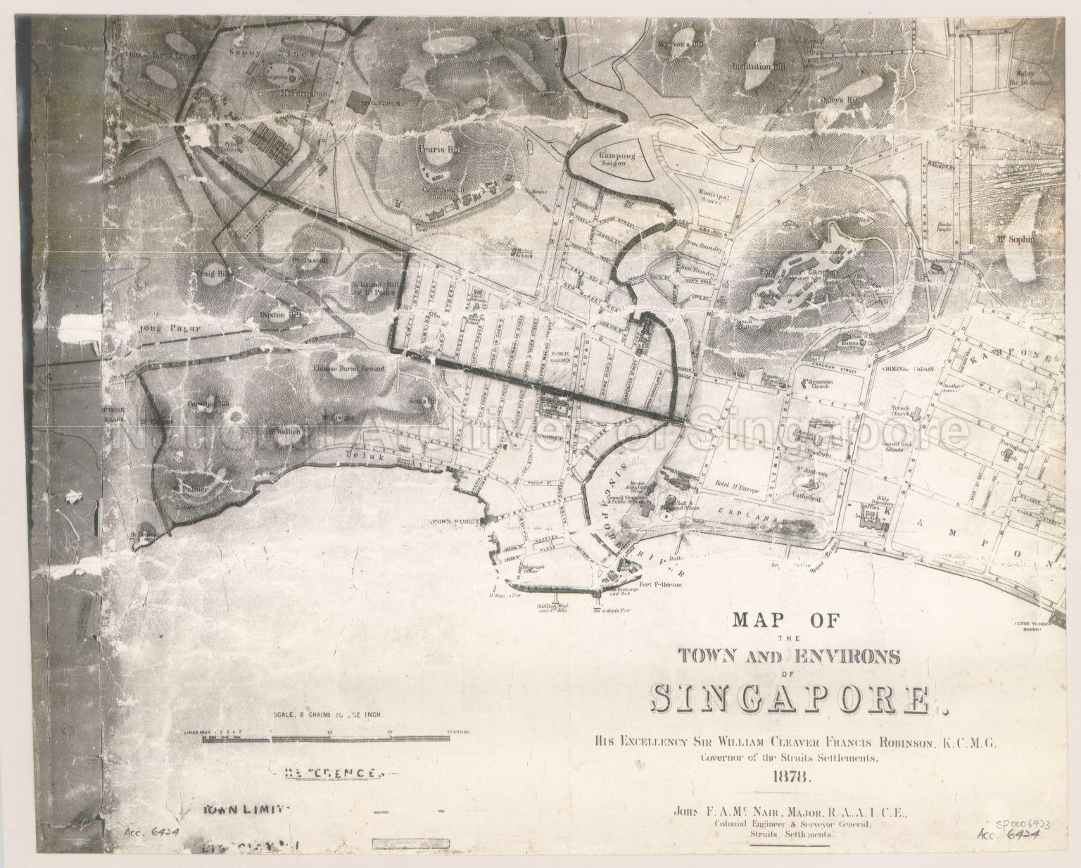 Map of the Town and Environs of Singapore Showing physical landscape, town limits, buildings, churches, hotels, villages, burial grounds, town market, Johnston's Pier, and others