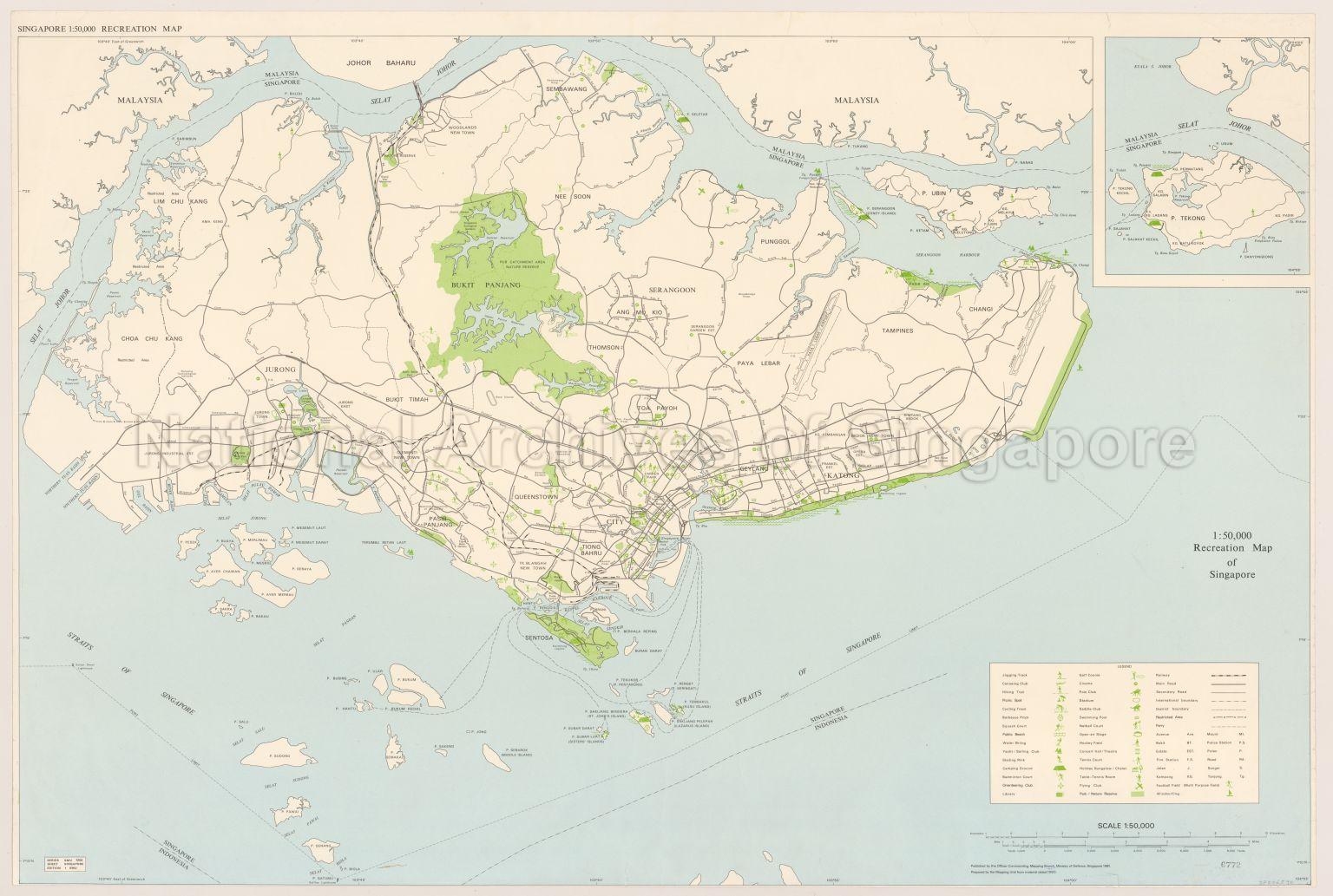 Map shows international boundaries, district boundaries, major road system, railway leading to the Causeway, new towns, location of various sports facilities, parks, reservoirs, nature reserves, ferry routes to the smaller islands, Public Utilities Board Catchment Area, Botanic Gardens, Singapore Zoological Gardens, Bukit Batok Park, Jurong Lake, Jurong Bird Park, Singapore Science Centre, Changi Airport, Paya Lebar Airport, Straits of Singapore, and others. Inset: Pulau Tekong