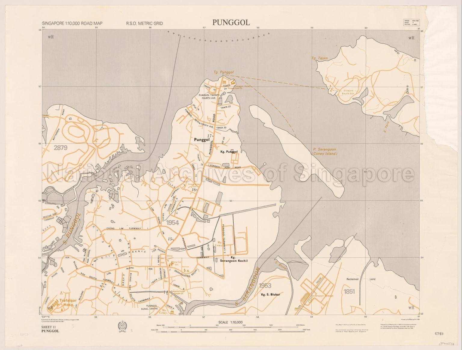 Map shows schools, community centres, clinics, places of worship, reclaimed land, Trafalgar Hospital, Muslim cemeteries, Punggol Hotel, Punggol Point Community Centre, Kampong Sungei Tengah Community Centre, Punggol Rural Centre, Kampong Sungei Blukar, Kampong Serangoon Kechil, Serangoon Sewage, Sungei Blukar, Sungei Punggol, Pulau serangoon (Coney Island), and others