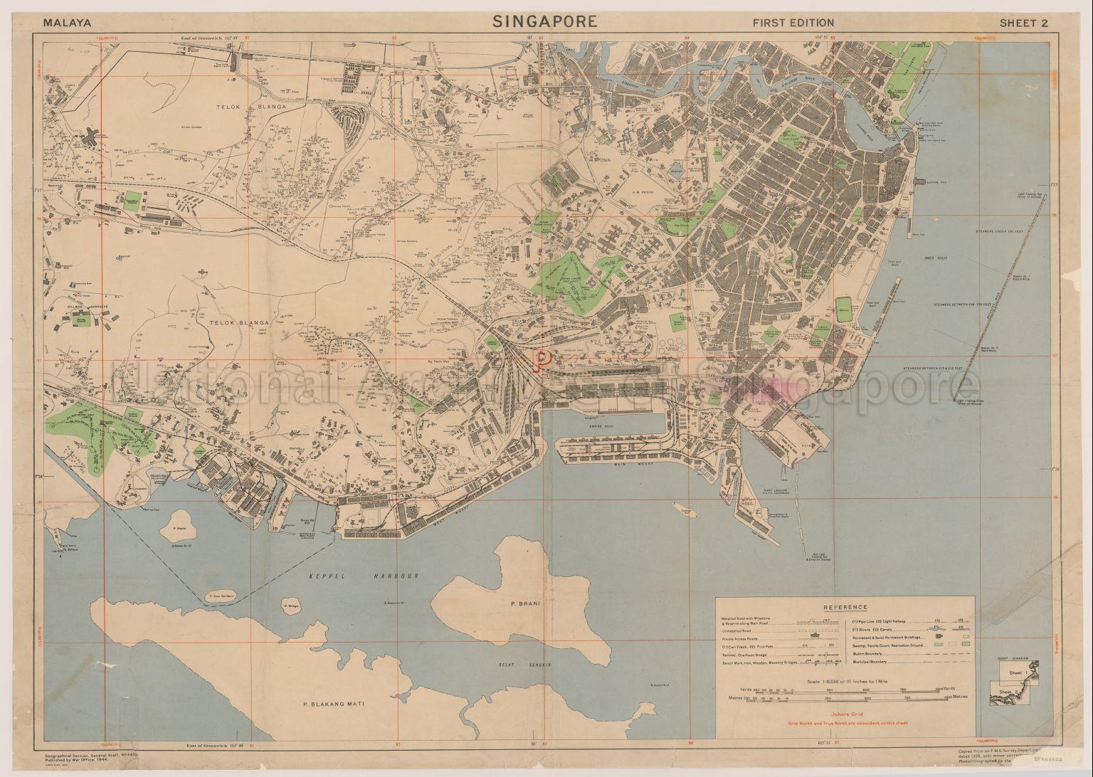 Singapore Map covers Telok Blanga (Telok Blangah), Pulau Brani, Pulau Blakang Mati, Pulau Hantu, Keppel Harbour, showing boundaries, buildings, bungalows, swamps, railway, godowns, docks, Chinese cemeteries, Mohamedan cemeteries, Chinese temples, Observatory, Time Ball, Signal Station, Singapore Railway Station, Keppel House, Master Attendant's Pier, Government Animal Quarantine Station, Empire Cinema, Archipelago Brewery Company Limited, Hock Cheong Distillery, Thye Hong Biscuit Factory, Popular Biscuit Factory, Government Toddy Shop, Sin Chew Jit Poh Press, Hock San Brick Works, Eng Aun Factory, Wong Lan San Orphan Free School, Gillman Barracks, Duxton Plain, Friendly Hill, Singapore Improvement Trust Houses, Mount Faber, Bukit Ayam, Bukit Chermin, Pearl's Hill, Singapore River, Telok Ayer Basin, and others