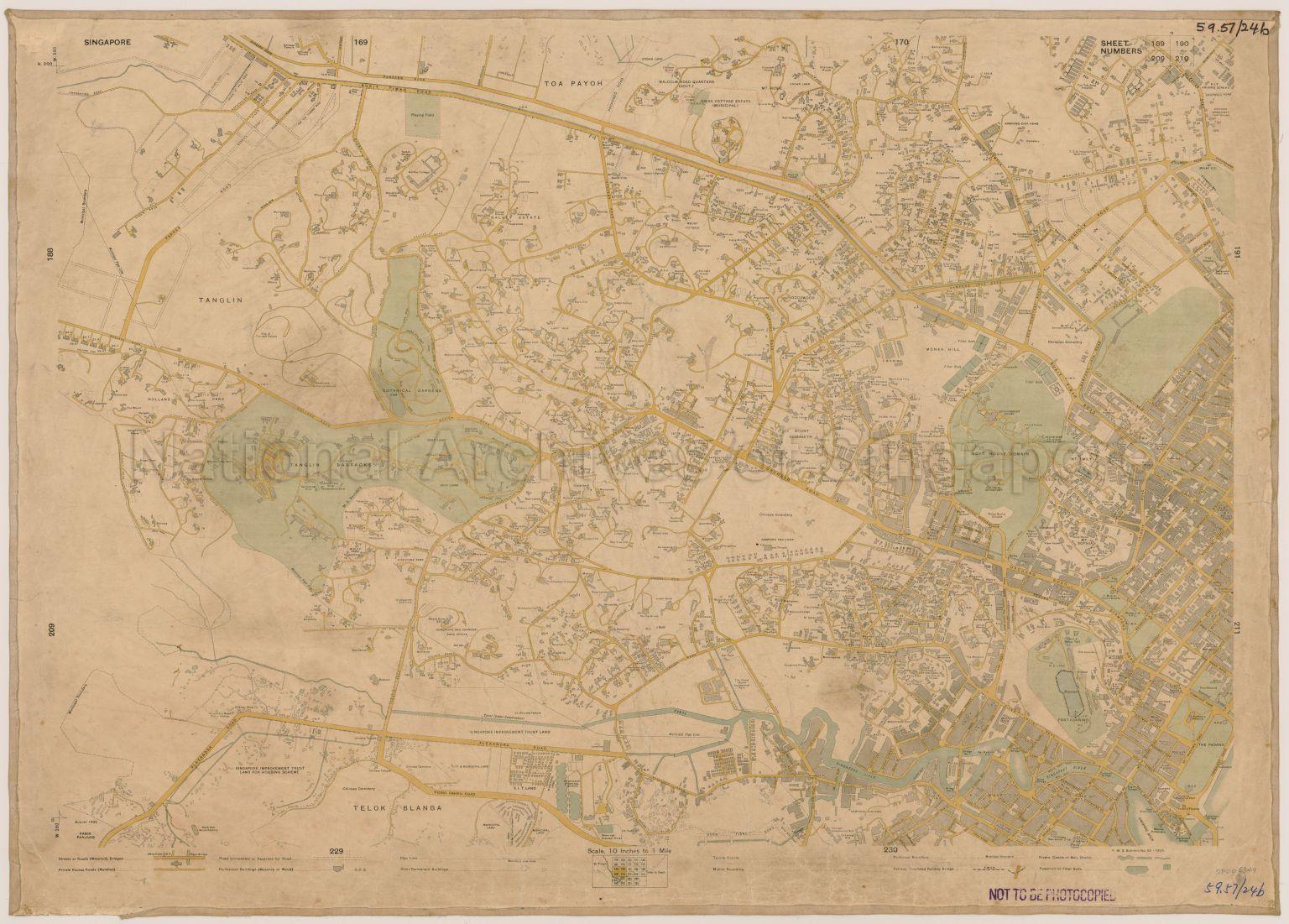 Singapore Map shows Municipal boundaries, buildings, bungalows, bridges, Chinese cemeteries, Chinese temples, Singapore Improvement Trust Housing Scheme, Raffles College, Adam Place, Dalvey Estate, Swiss Cottage Estate, Eden Hall, Kampong Chia Heng, Kampong Teo Chew, Kampong Bintang, Government House Domain, Fort Canning, Singapore River, Municipal Pipeline, Singapore Improvement Trust Land for housing scheme, Tanglin Barracks, War Department land, Tanglin, Toa Payoh, Telok Blangah, and others