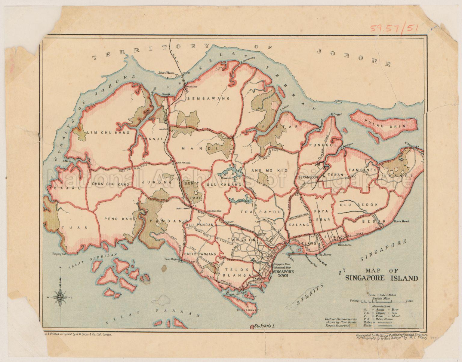 Map shows district boundaries, forest reserves, main roads, railway, reservoirs, Tanjong Pagar, Johnston's Pier, Singapore River, Lim Chu Kang, Kranji, Sembawang, Seletar, Mandai, Bajau, Tuas, Choa Chu Kang, Peng Kang, Pandan, Jurong, Bukit Timah, Ulu Pandan, Pasir Panjang, Telok Blangah, Tanglin, Singapore Town, Toa Payoh, Ulu Kalang, Ang Mo Kio, Punggol, Serangoon, Teban, Tampines, Changi, Ulu Bedok, Bedok, Siglap, Kallang, Geylang, and others