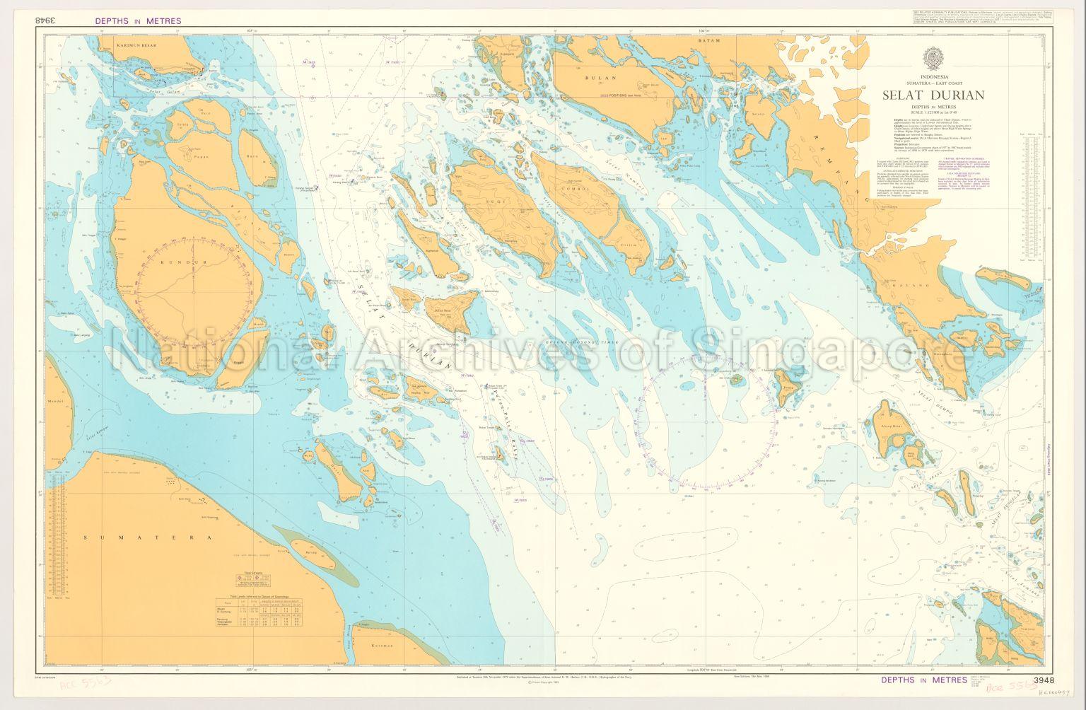 Chart serves as notice to mariners showing data on depths of water, clarity of water, obstructions, fishing stakes, Batam, Rempang, Galang, sumatera, Kundur and others