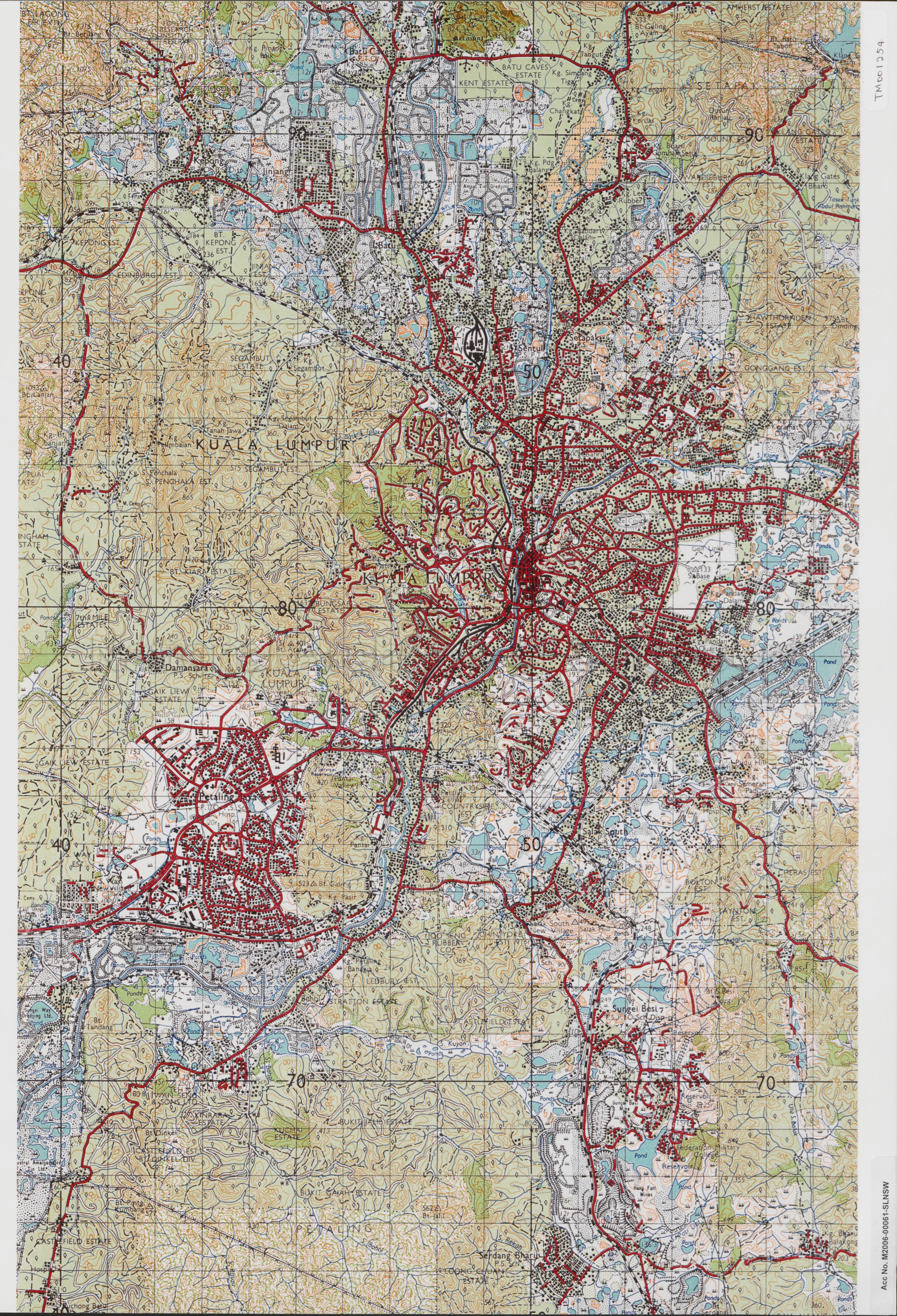 Malaysia. Kuala Lumpur Map shows contours, physical landscape, trigonometrical stations, land use, buildings, roads, railways, reservoirs, rivers, swamps, ponds, housing estates, rubber estates, tin mines, Batu Caves, Federation Military College, Golf Links, Pantai Valley, and others
