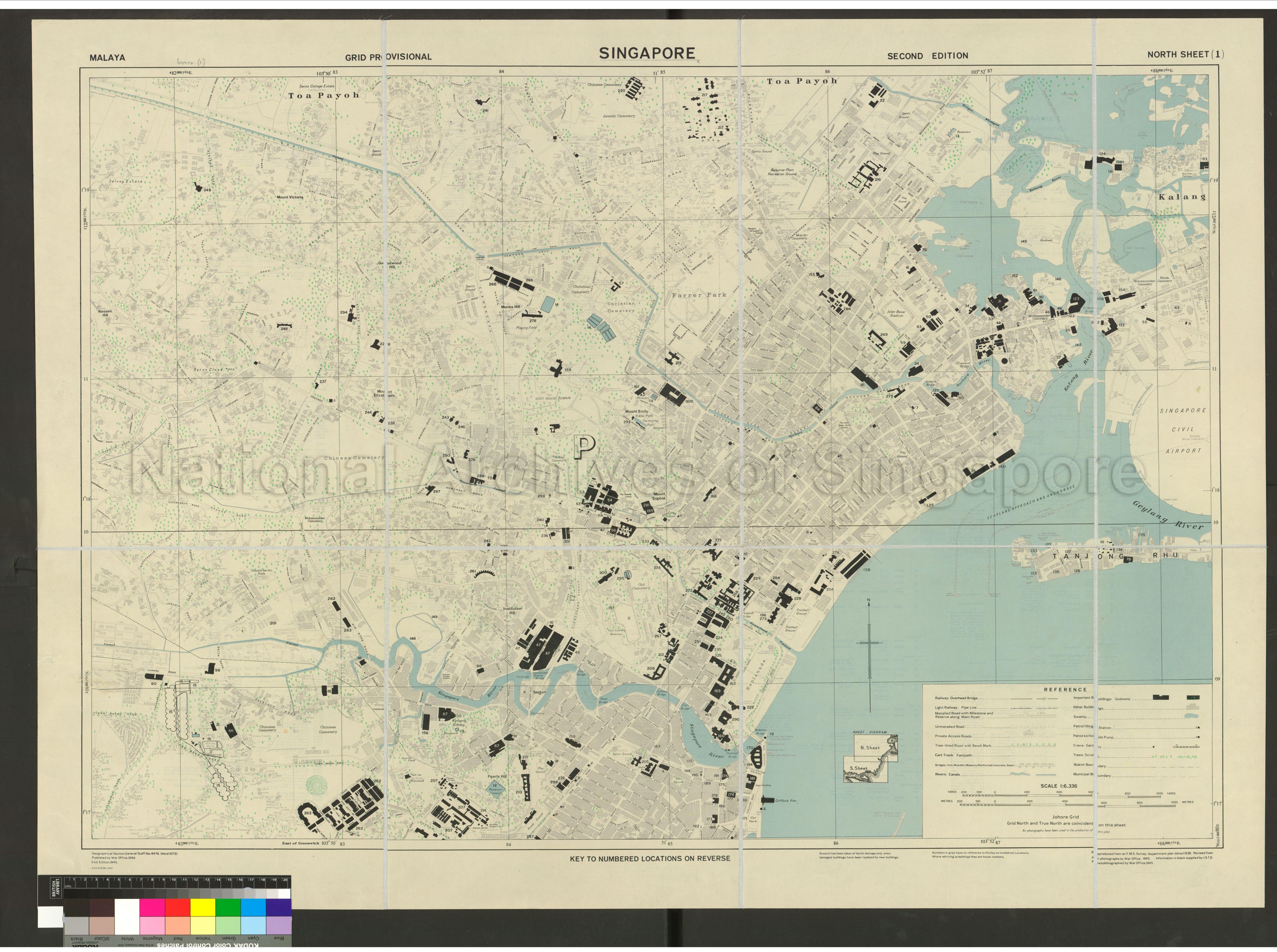 Malaya. Grid Provisional. Singapore Map shows buildings, schools, churches, godowns, blachan factory, cemeteries, tidal swamps, Jalan Besar Stadium, Swiss Cottage Estate, Dalvey Estate, Mount Victoria, Nassim Hill, Seton Close, Institution Hill, Mount Sophia, Mount Emily, Farrer Park, Monks Hill, Esplanade, Singapore Civil Airport, Pulau Saigon, Kampong Bintang, Singapore River, Rochore River, Kalang River, Geylang River, Tanjong Rhu, and others