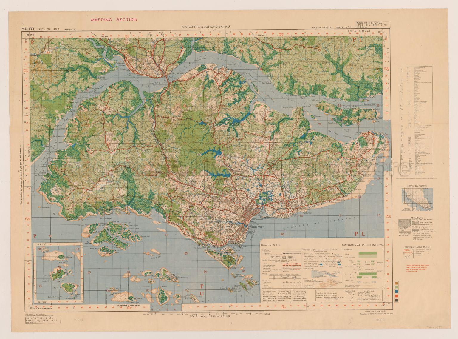This 1945 topographical map of Singapore island is one of the rare few produced by Indian military surveyors following the return of the British to Singapore after the Japanese surrender. The map’s distinctive color schemes, with areas of farmland marked in bright yellow, followed the survey of India standard colours. Local food production was vital for the plans of returning British administrators to rehabilitate Singapore, which had suffered greatly during the occupation.