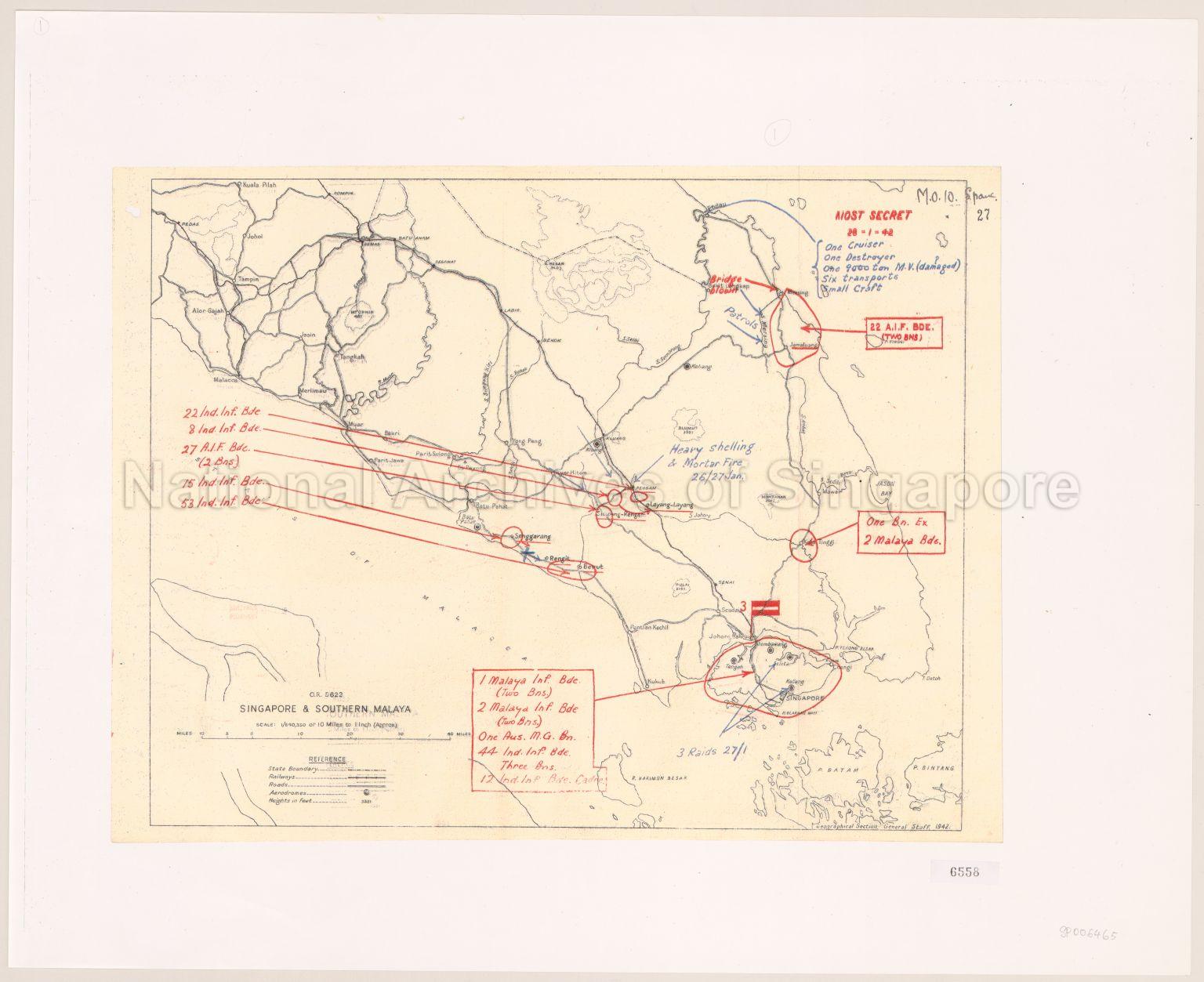 Map showing state boundaries, places, railway, roads, aerodromes, deployment of defence forces during Japanese occupation, dates and sites of raids, heavy shelling and mortar fire, and others