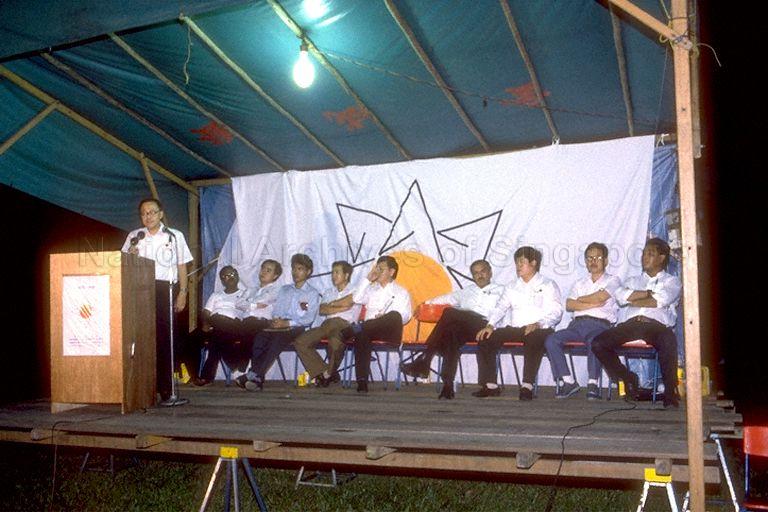 A CANDIDATE OF THE NATIONAL SOLIDARITY PARTY (NSP) SPEAKS DURING THE ELECTION RALLY AT ANG MO KIO