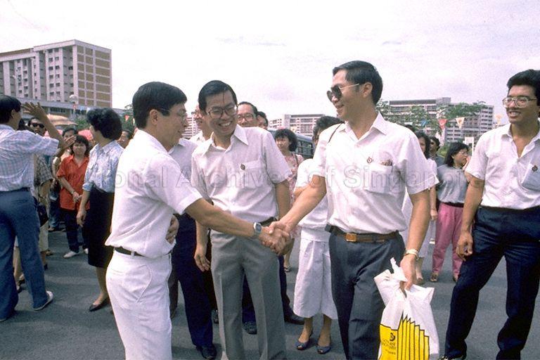PEOPLE'S ACTION PARTY (PAP) CANDIDATE FOR TAMPINES GROUP REPRESENTATION CONSTITUENCY (GRC), MR MAH BOW TAN MEETS OPPOSITION CANDIDATE AT EAST VIEW SECONDARY SCHOOL ON NOMINATION DAY FOR THE 1988 GENERAL ELECTIONS