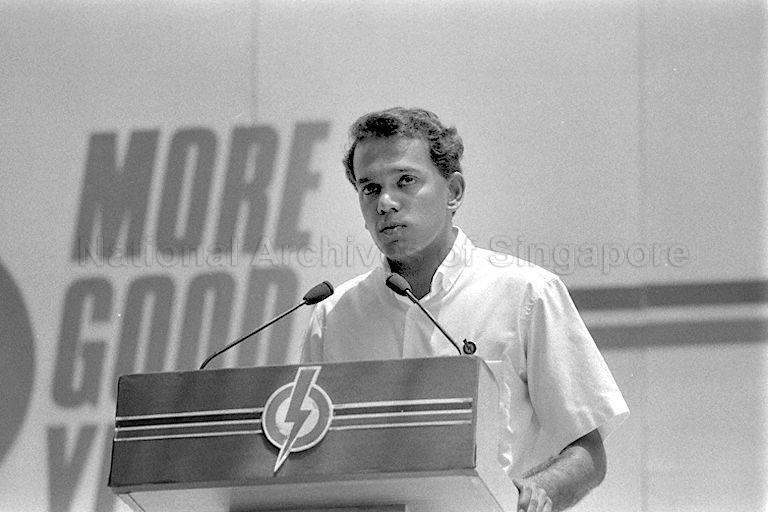 PEOPLE'S ACTION PARTY (PAP) CANDIDATE K SHANMUGAM SPEAKING AT PAP ELECTION RALLY FOR THE 1988 GENERAL ELECTION IN FULLERTON SQUARE