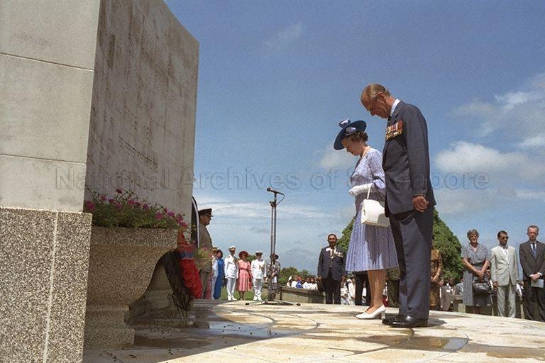 WREATH LAYING CEREMONY BY HER MAJESTY QUEEN ELIZABETH II AND HIS ROYAL HIGHNESS DUKE OF EDINBURGH PRINCE PHILIP AT KRANJI WAR MEMORIAL