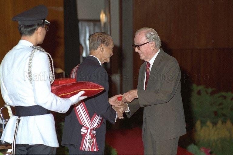President Wee Kim Wee presenting the Public Service Star medal to Managing Director of Singapore Orchids John Ede at investiture ceremony for National Day awards at Singapore Conference Hall