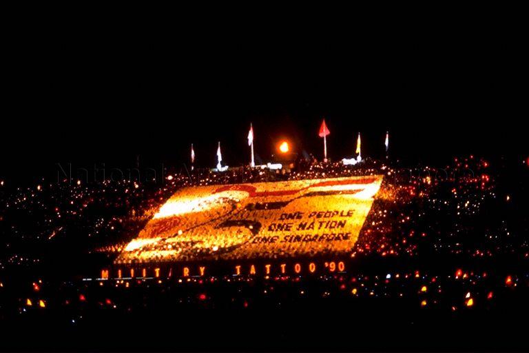 NIGHT VIEW OF FLASH CARD DISPLAY TO MARK SINGAPORE'S 25TH ANNIVERSARY AT SPECTATOR STANDS DURING SINGAPORE ARMED FORCES (SAF) MILITARY TATTOO IN NATIONAL STADIUM
