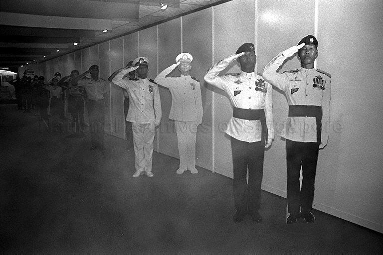 SINGAPORE ARMED FORCES' (SAF) OFFICERS GIVING A SALUTE AT OPENING OF SAF EXHIBITION AT PAYA LEBAR AIRPORT