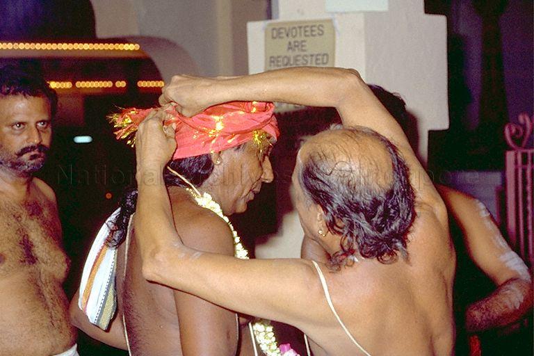 PRIEST PREPARES DEVOTEES FOR FIRE-WALKING CEREMONY AT SRI MARIAMMAN TEMPLE, SOUTH BRIDGE ROAD